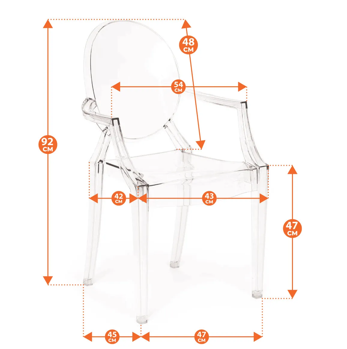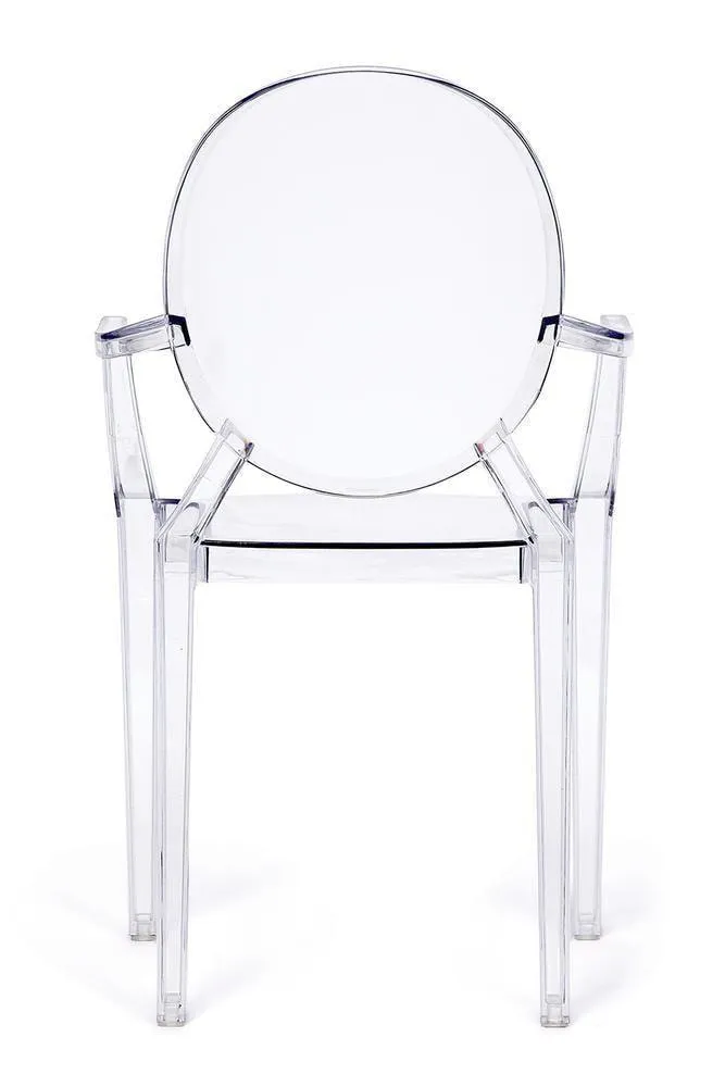 Стильное кресло MEDALION из коллекции Modern выполнено в стиле прозрачного стула Louis Ghost, созданного гениальным французским дизайнером Филиппом Старком. Изящная форма, овальная спинка и изогнутые ножки в сочетании с прозрачным пластиком подчеркивают уникальность и универсальность кресла. Классические очертания и визуальная воздушность позволяют ему вписаться в любой стиль интерьера: от классического до стиля бохо. Благодаря прозрачной поверхности, отражающей свет, и визуальной легкости кресло станет идеальным решением для небольших помещений. Удобная спинка и высокие подлокотники обеспечат комфорт для продолжительного отдыха. Кресло изготовлено из прочного бесцветного пластика, оно устойчиво к механическим повреждениям и нагрузкам, выдерживает большой вес. Эта удобная, легкая модель способна стать отличным украшением террасы загородного дома, интерьера городской квартиры или веранды кафе. Кресло подойдёт для гостиной, для кухни, для ресторана или для веранды. Кресло поставляется в собранном виде.