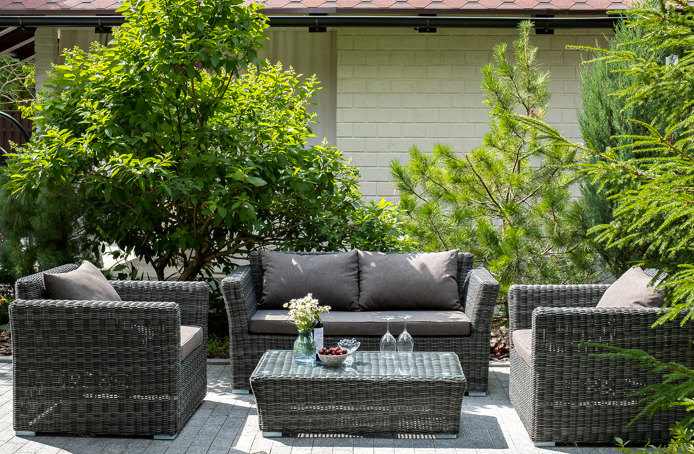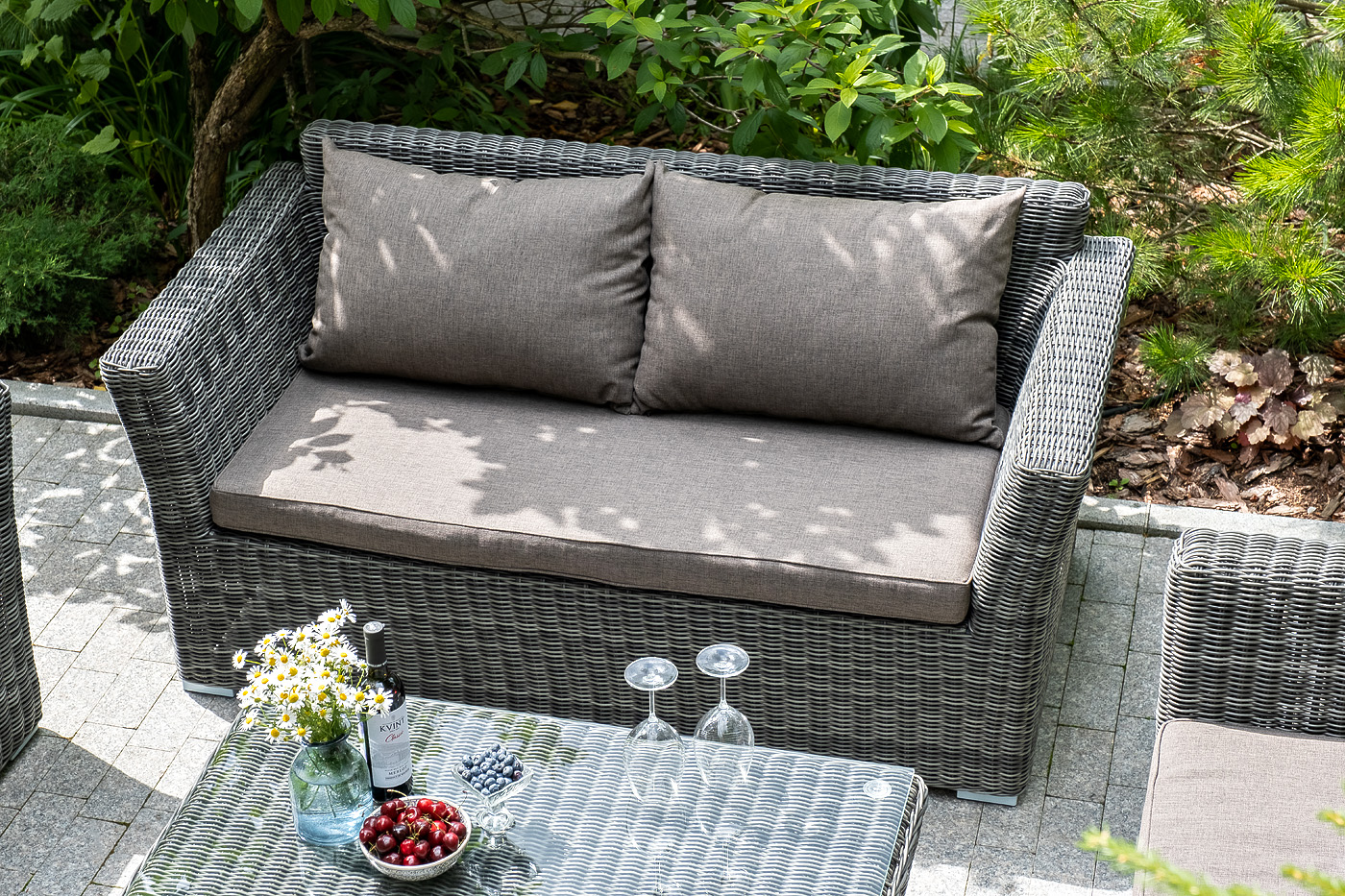 Прочный алюминиевый каркас усиливает устойчивость мебели. Его дополняет плетение в цвете "графит", которое представлено из круглого искусственного ротанга.