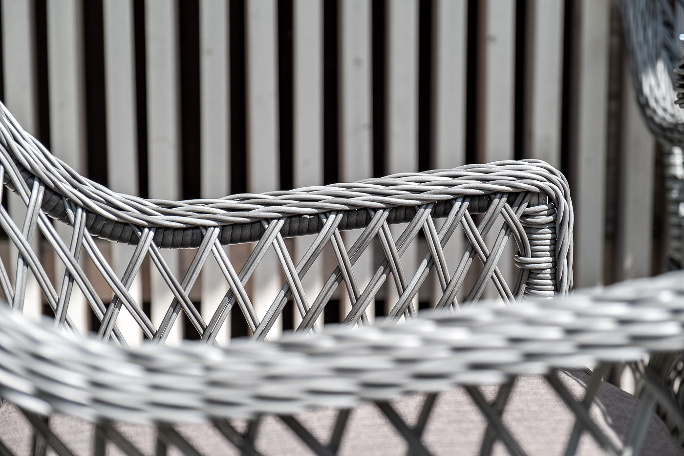 Каркас мебели выполнен из прочного и легкого алюминия, оплетенного вручную долговечным искусственным ротангом графитового цвета, столешница – закаленное стекло.