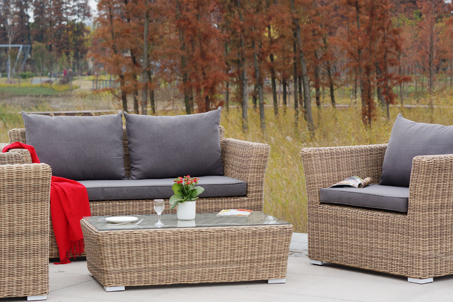 Прочный алюминиевый каркас усиливает устойчивость мебели. Его дополняет соломенная оплетка, которая представлена из круглого искусственного ротанга.