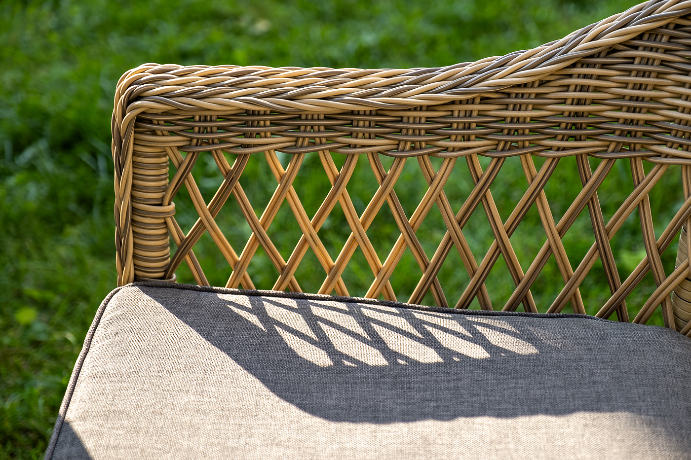Мебель имеет надежный каркас из легкого алюминия. Изделия дополнительно оплетены ручным методом круглым искусственным ротангом натурального цвета соломы.