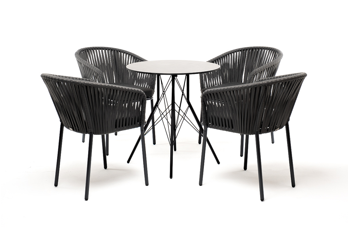 4 кресла из коллекции «Бордо», выполненных из алюминиевого каркаса и ручной оплетки роупом. Это эластичные синтетические ленты из высокопрочных полиэфирных волокон, представлены в темно-сером цвете.