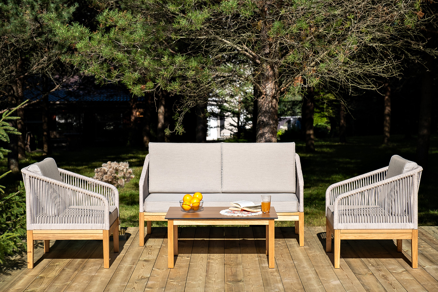 Каркас уличной мебели выполнен из дуба. Его дополняет бежевая оплетка, изготовленная на основе эластичных синтетических лент из полиэфирных волокон высокой прочности.