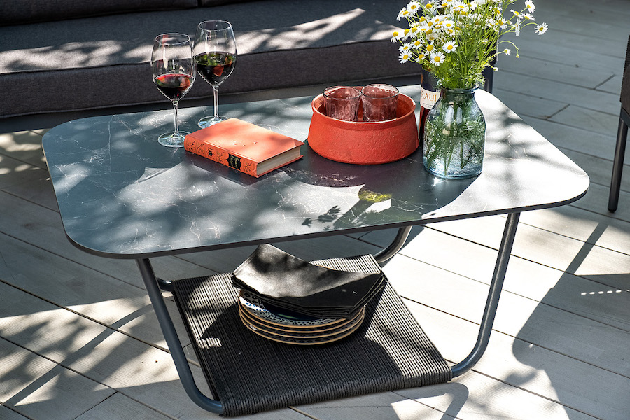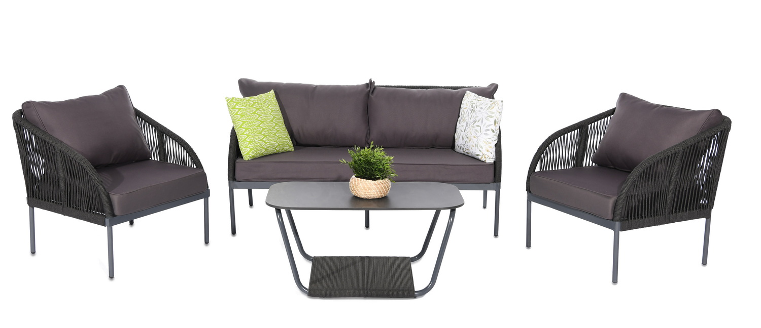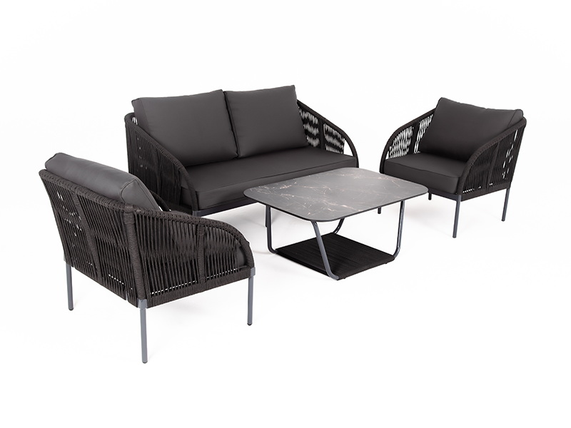 Каркас уличной мебели выполнен из износостойкого алюминия. Его дополняет серая ручная оплетка, изготовленная на основе эластичных синтетических лент из полиэфирных волокон высокой прочности.