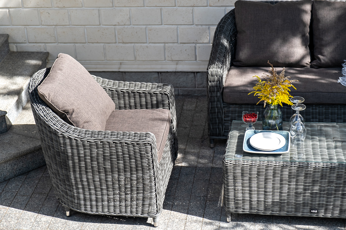 В основе мебели - алюминиевый каркас и круглый искусственный ротанг. Каркас оплетен с помощью ручного метода и представлен в графитовом цвете.