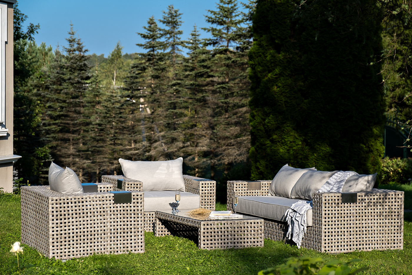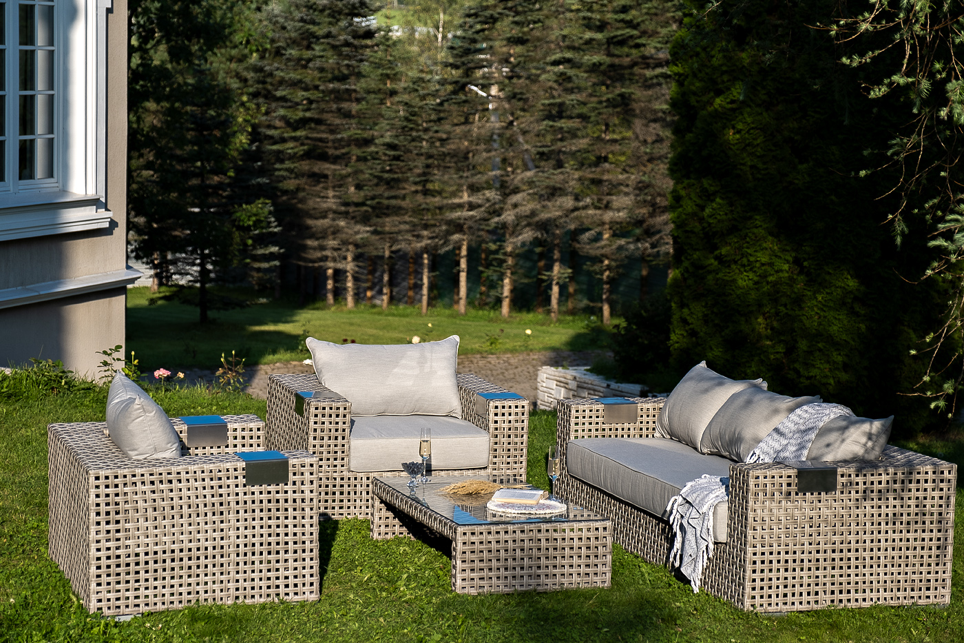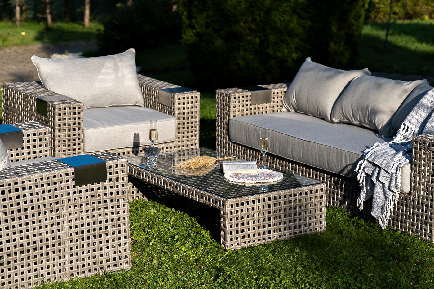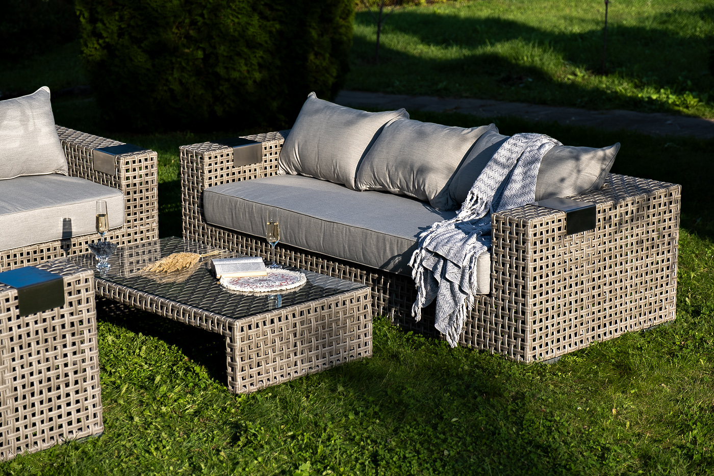 Подлокотники плетеного дивана и кресел оснащены алюминиевыми подставками, на которые можно поставить бокал или тарелку.