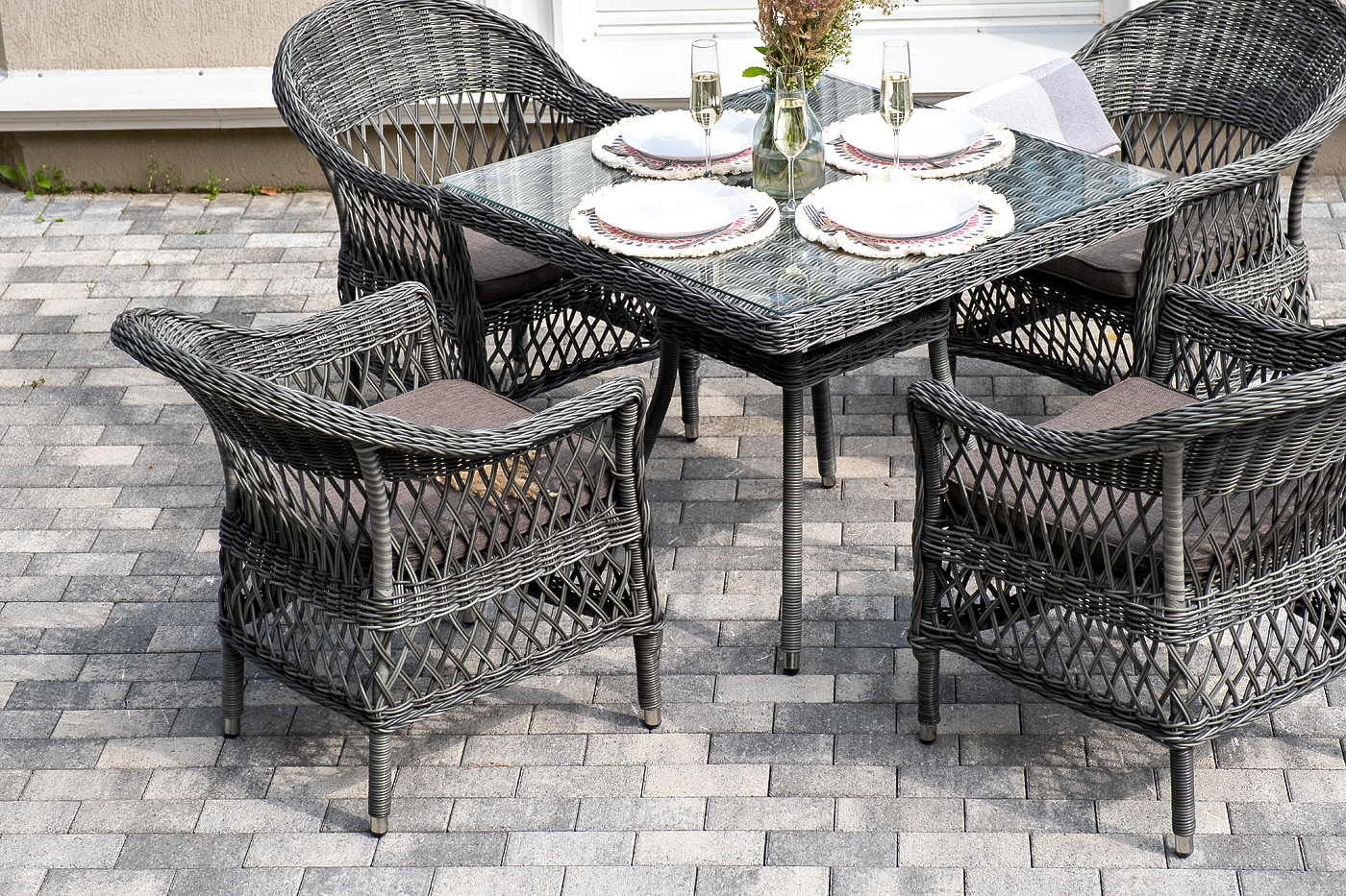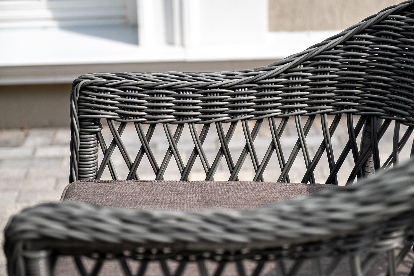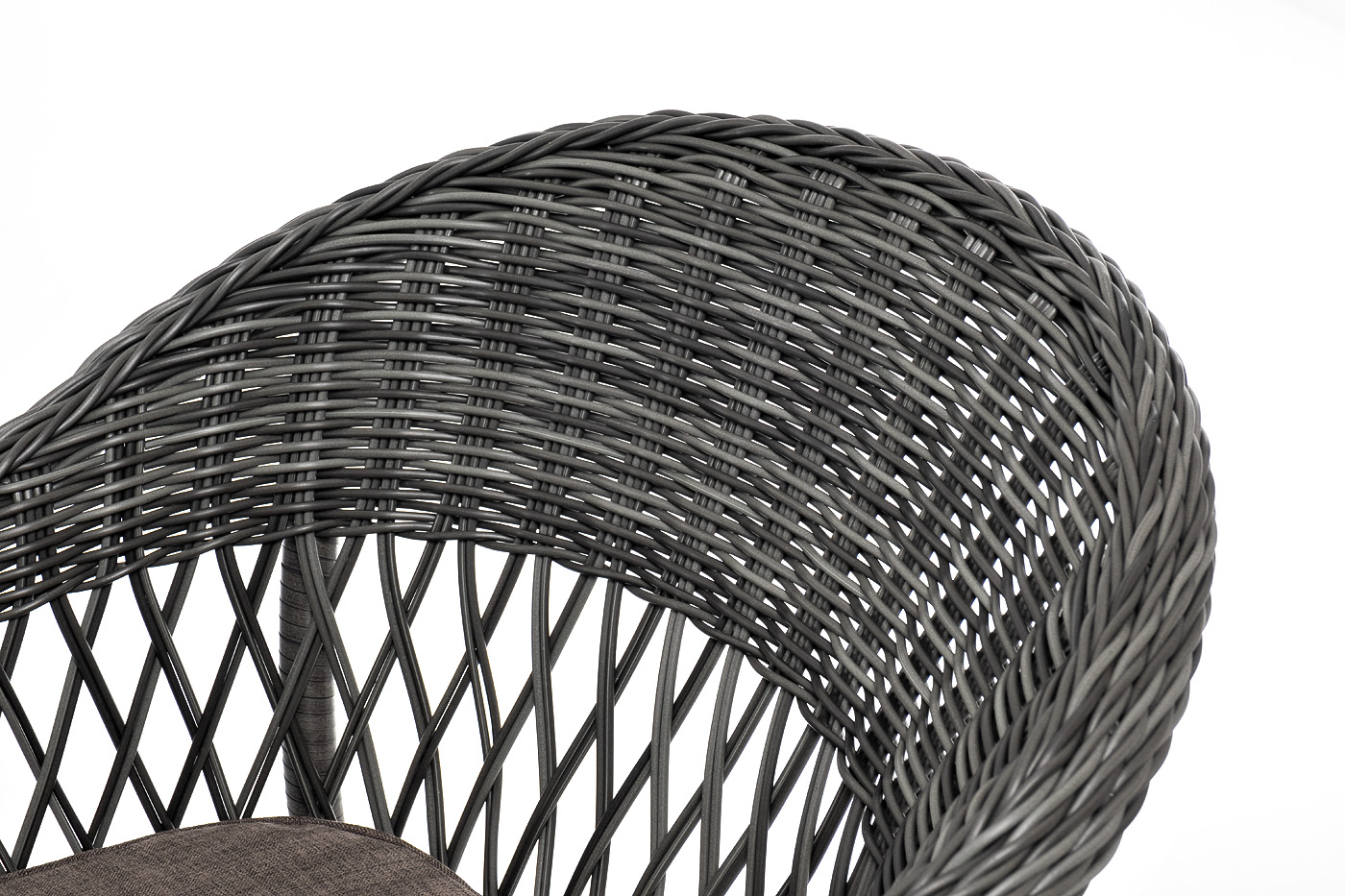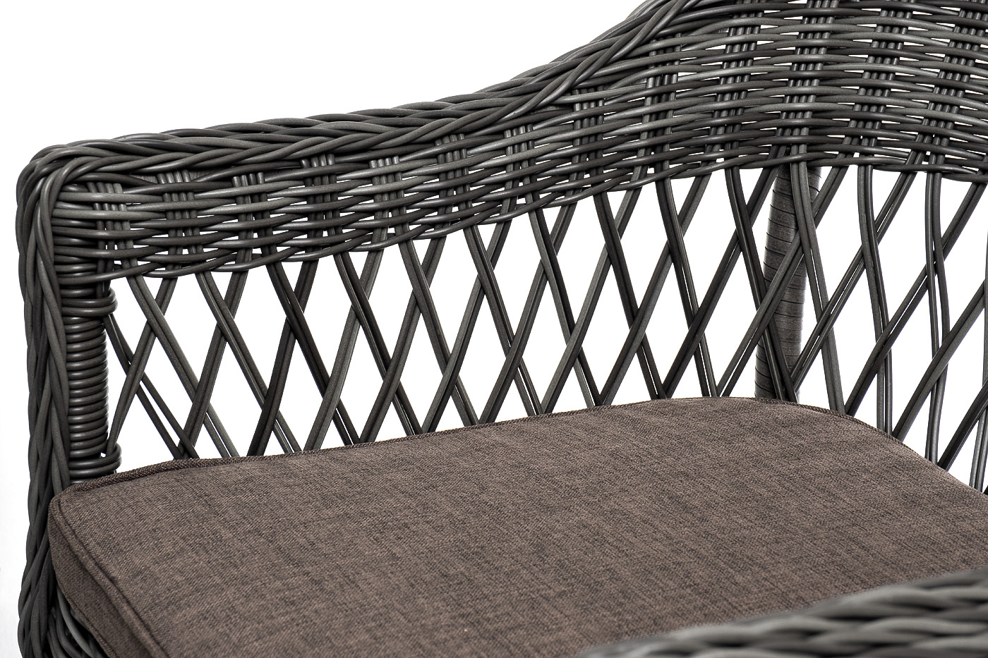 Мебель имеет надежный каркас из легкого алюминия. Изделия дополнительно оплетены ручным методом круглым искусственным ротангом натурального графитового цвета.