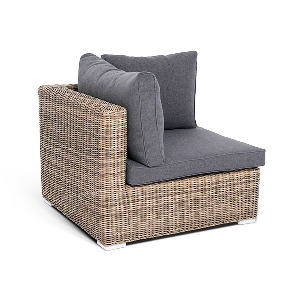 «Лунго» угловой модуль из круглого искусственного ротанга, является неотъемлемой частью лаунж-зоны, в своем основании имеет каркас из алюминия, который вручную оплетен ротангом натурального соломенного цвета.