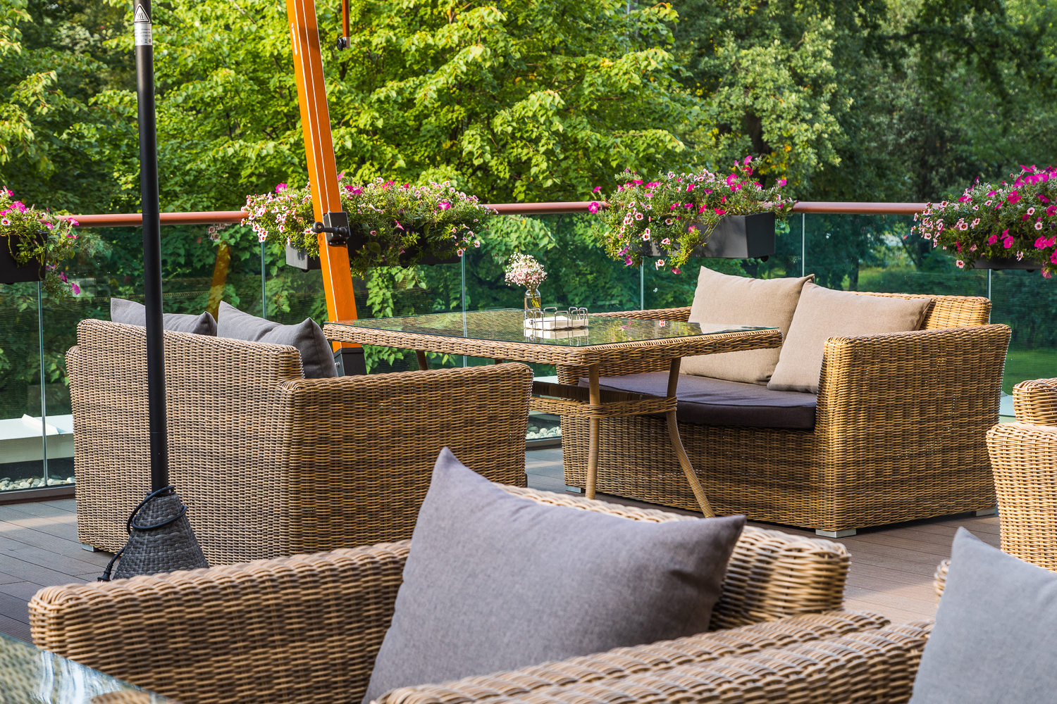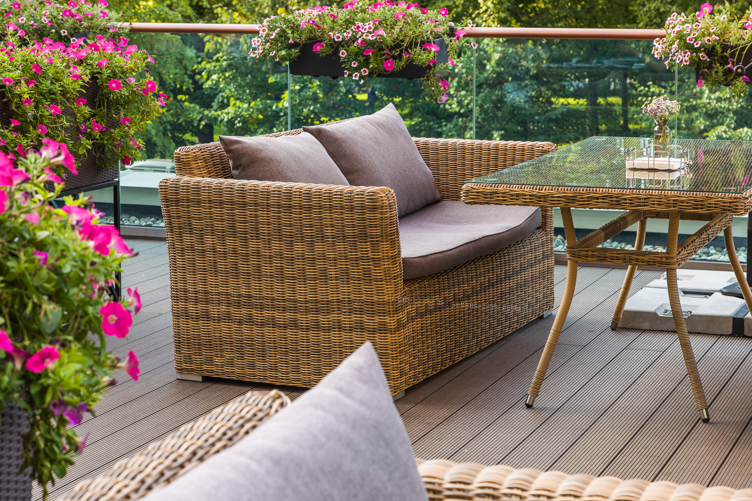 Диван выполнен из круглого искусственного ротанга соломенного цвета, оплетенного вручную.