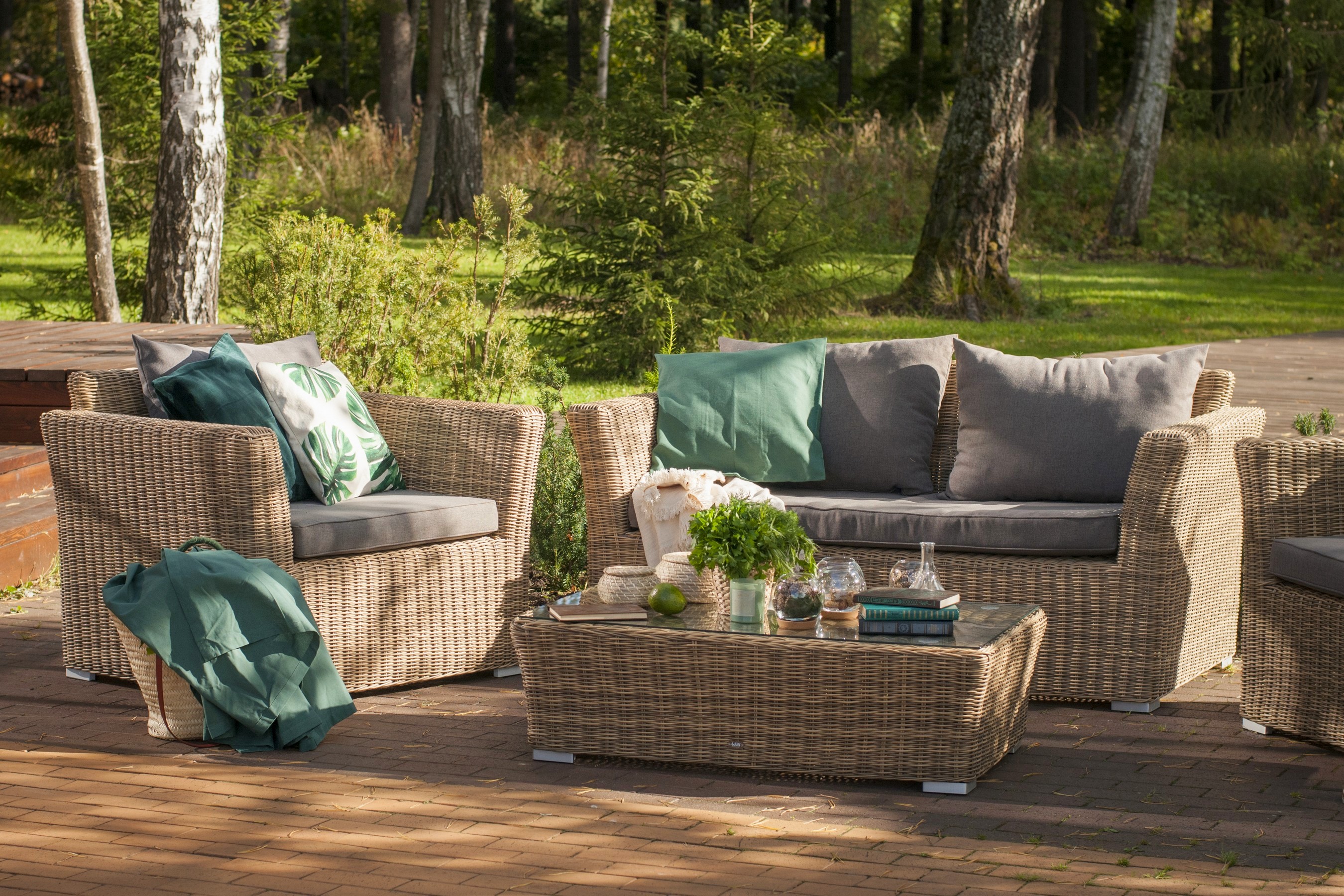 Двухместный диван дополнен несколькими подушками со съёмными серо-коричневыми чехлами. Они изготовлены из прочного полиэстера, плотность которого достигает 230гр/м2. Предусмотрена влагоотталкивающая пропитка ткани для защиты текстильных изделий от намокания.