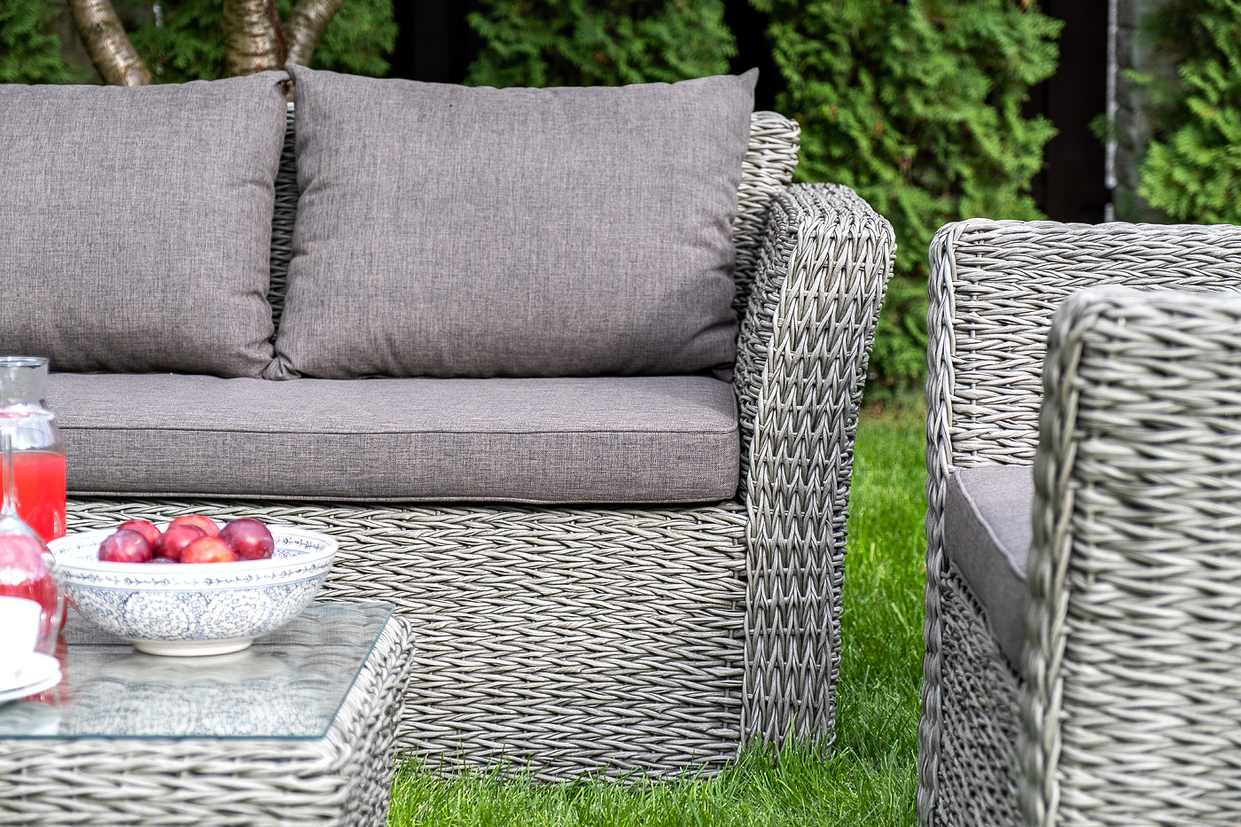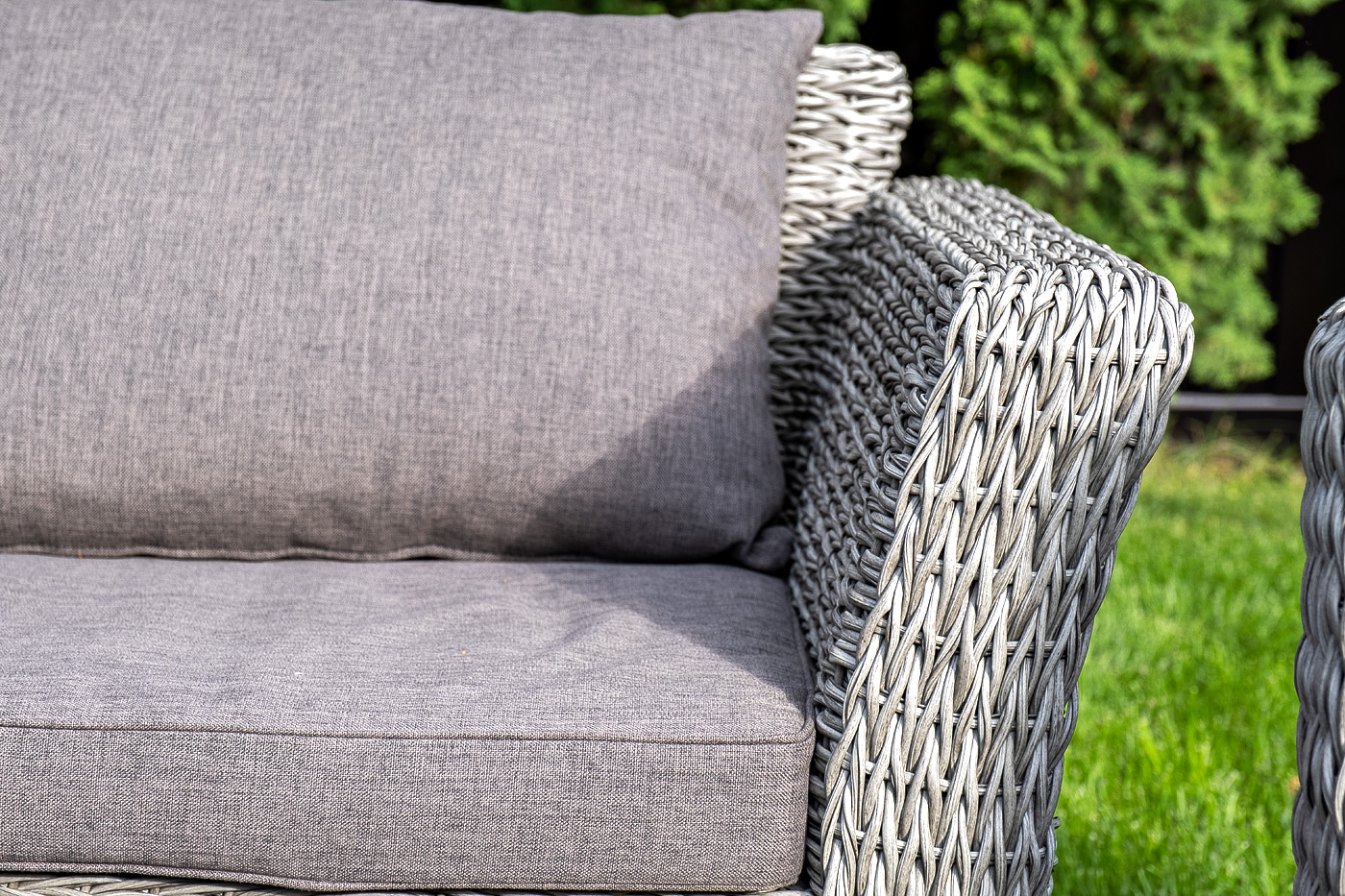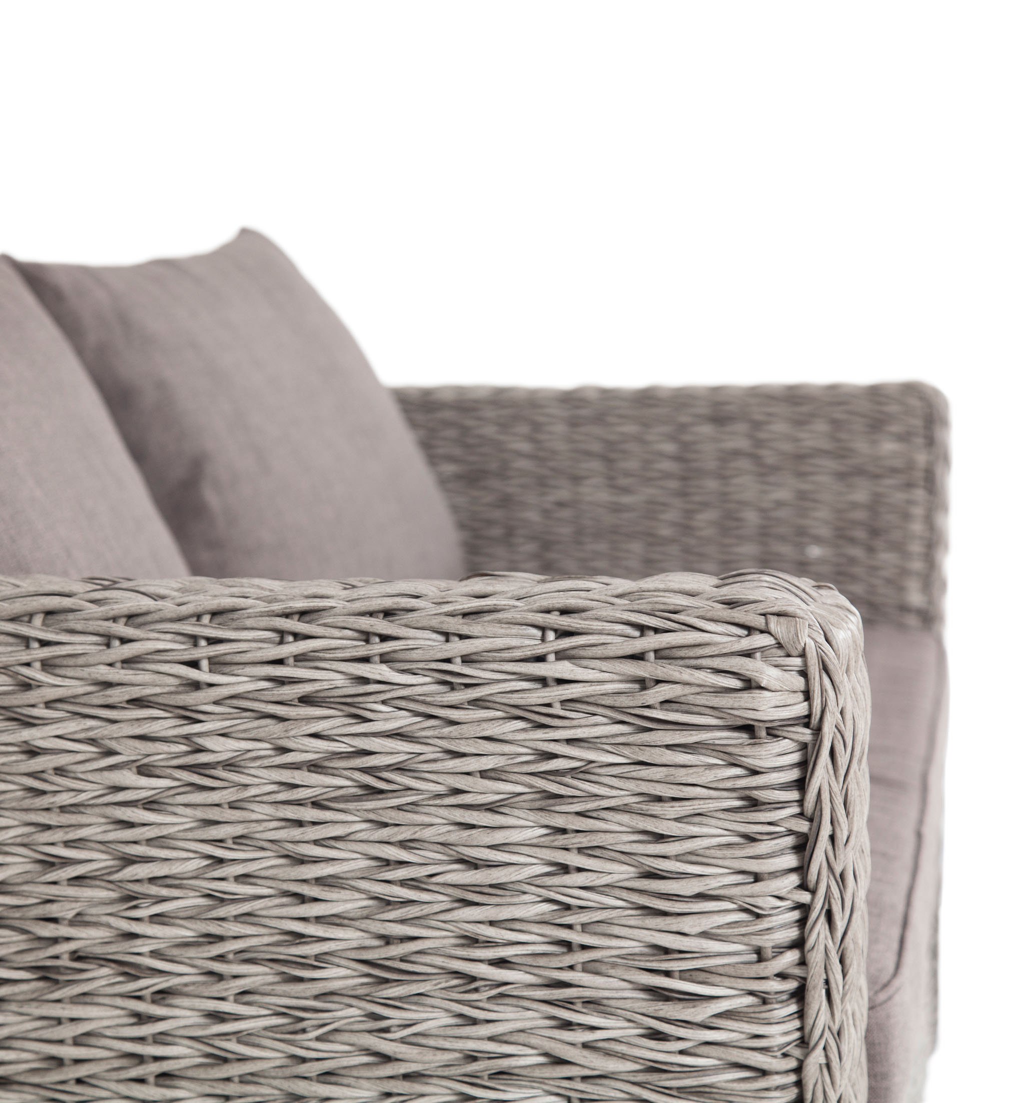 Диван выполнен из искусственного ротанга вида «гиацинт» серого цвета, оплетенного вручную.