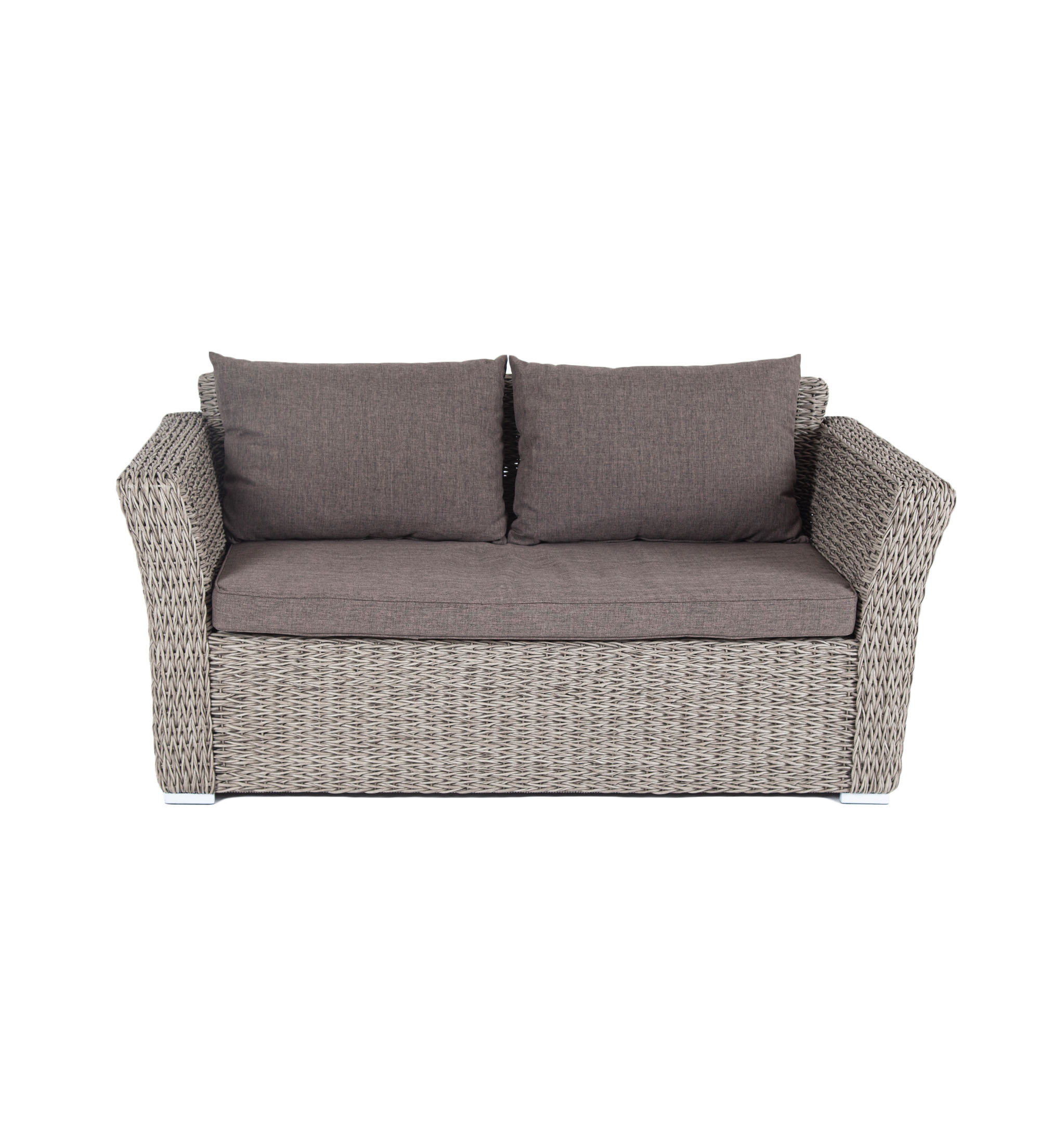 Двухместный диван дополнен несколькими подушками со съёмными серо-коричневыми чехлами. Они изготовлены из прочного полиэстера, плотность которого достигает 230гр/м2. Предусмотрена влагоотталкивающая пропитка ткани для защиты текстильных изделий от намокания.