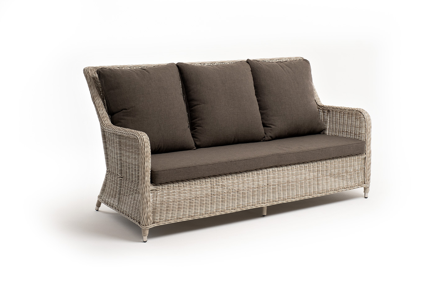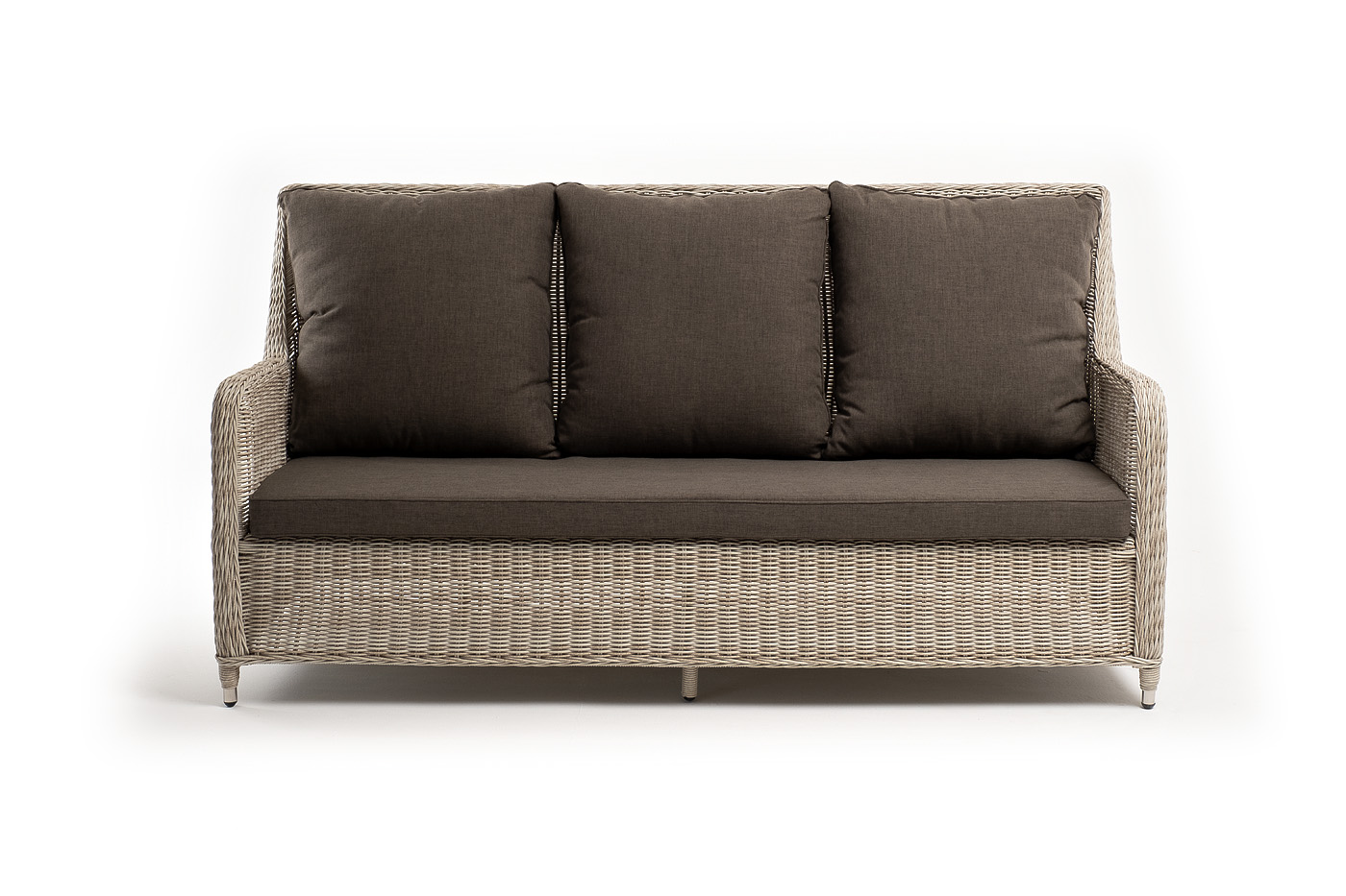 В комплекте с трехместным диваном идут мягкие подушки для комфортного расположения. Чехлы съёмные серо-коричневого цвета из высококлассного полиэстера с плотностью 230гр/м2. Защитные свойства ткани усиливаются при помощи влагоотталкивающей пропитки.