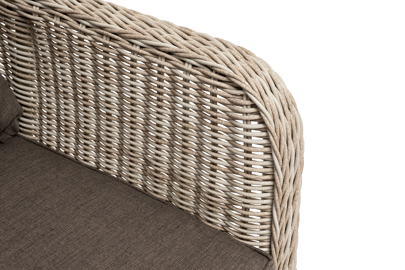 Ручное круглое плетение является основным декоративным элементом мебели. Оно выполнено из искусственного ротанга в бежевом цвете.