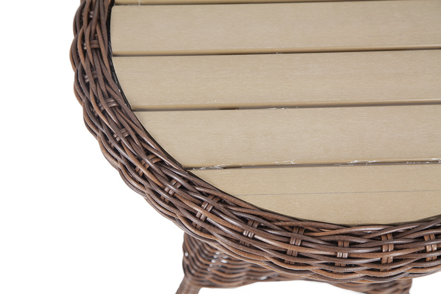 Рабочая поверхность столика выполнена из древесно-полимерного композита - ДПК. Материал обладает высокой износостойкостью и прочностью в ходе эксплуатации.