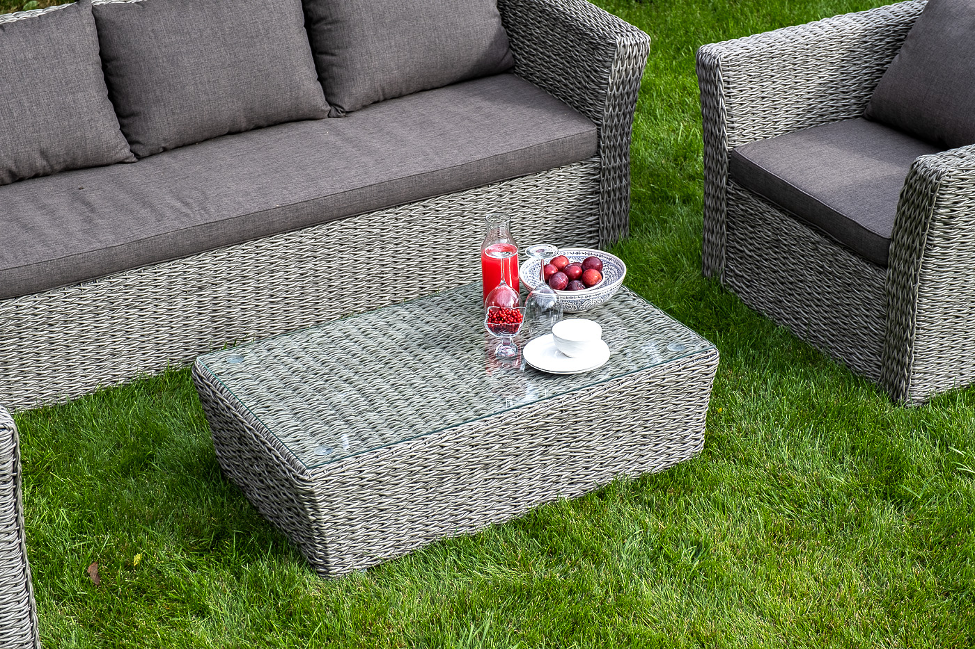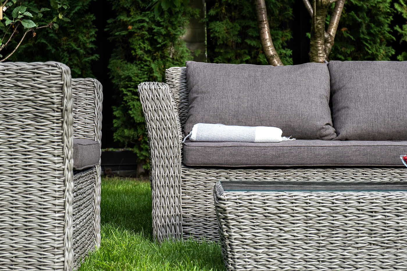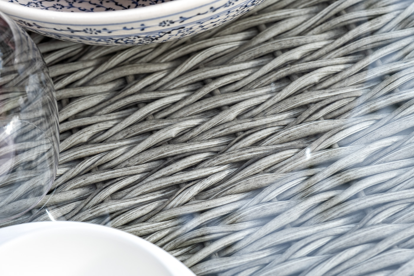Журнальный столик «Капучино» из искусственного ротанга вида "гиацинт" серого оттенка обладает прочным каркасом, изготовленным из алюминия, оплетка которого произведена ручным способом. Поверхность защищена столешницей из 5 мм стекла.