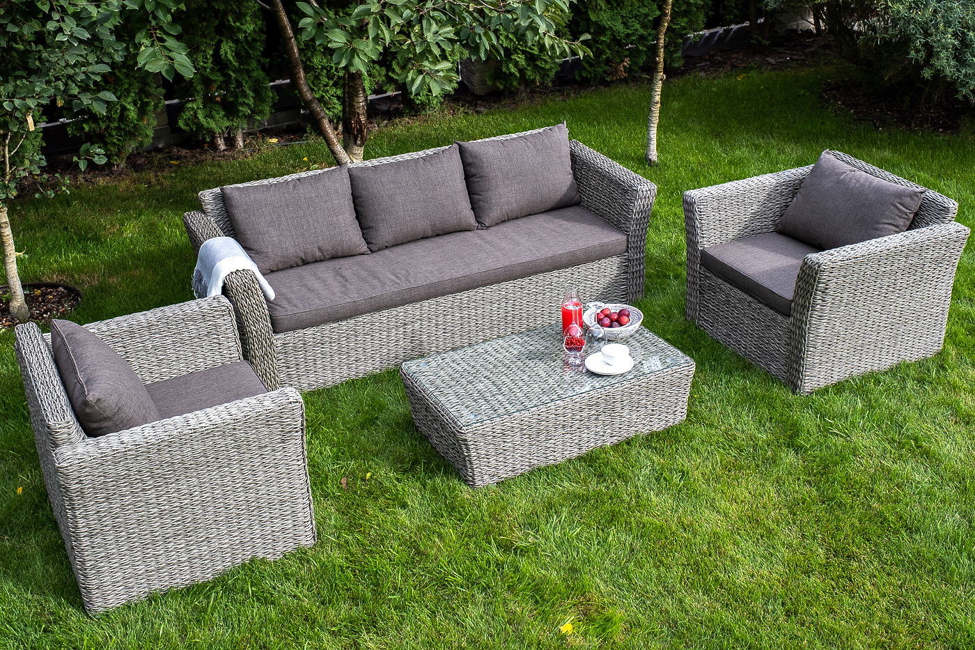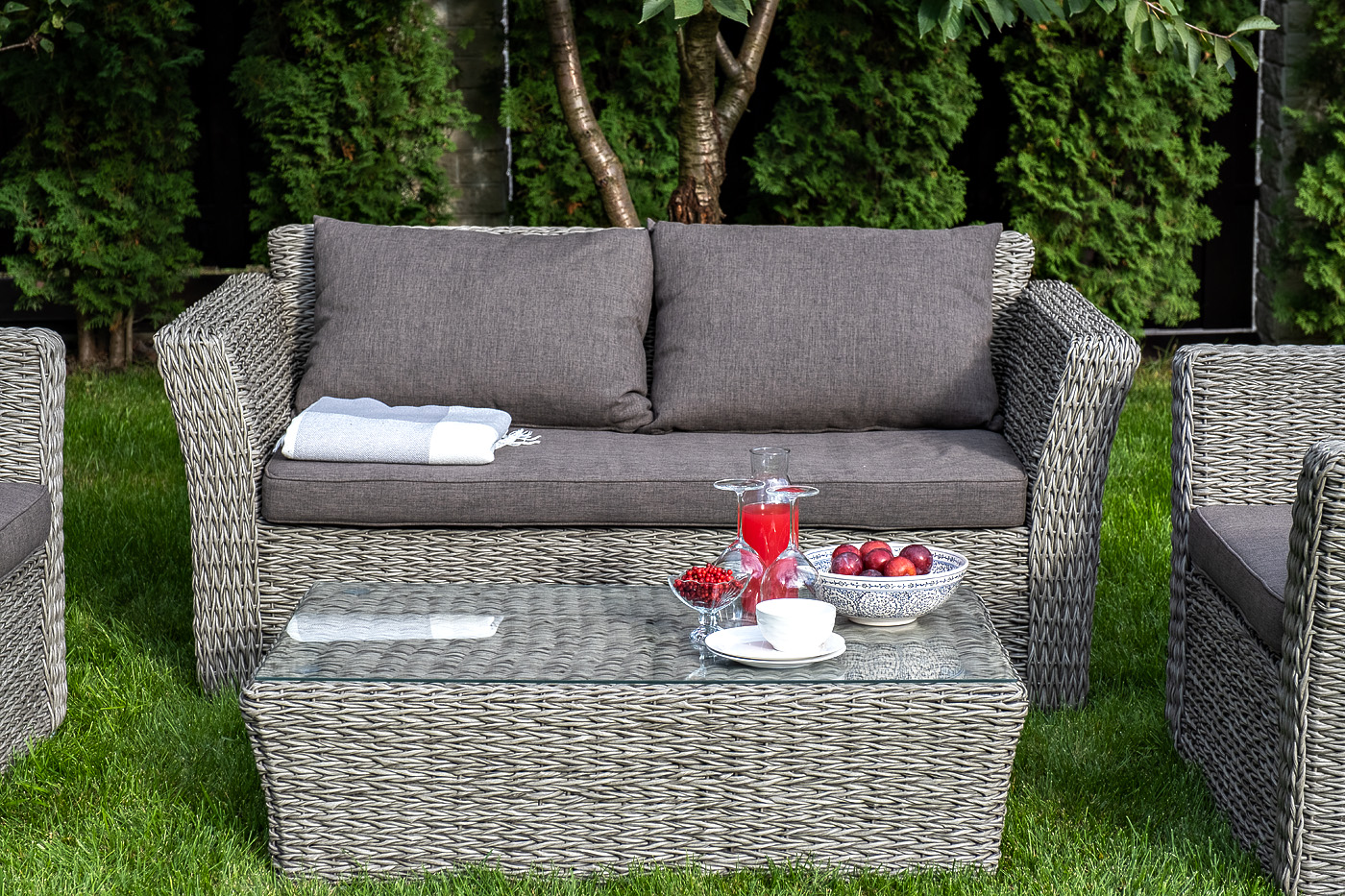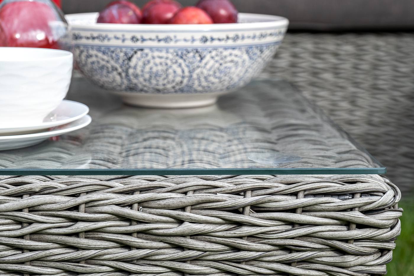 Журнальный столик «Капучино» из искусственного ротанга вида "гиацинт" серого оттенка обладает прочным каркасом, изготовленным из алюминия, оплетка которого произведена ручным способом. Поверхность защищена столешницей из 5 мм стекла.