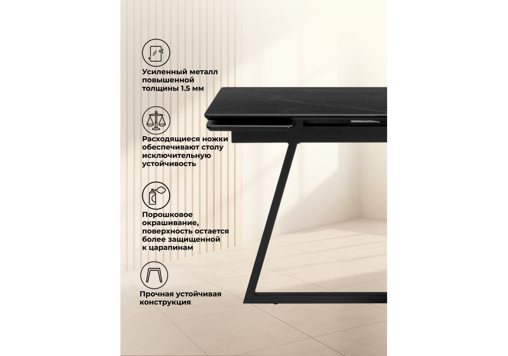 Керамический стол Памелла - представляет собой стильное и удобное решение для вашего интерьера. Цвет товара - черный, что позволяет выбрать оптимальное решение под ваш стиль и предпочтения. Каркас изделия - металл, обеспечивает прочность и долговечность конструкции, при этом сохраняя легкость и изящество дизайна.