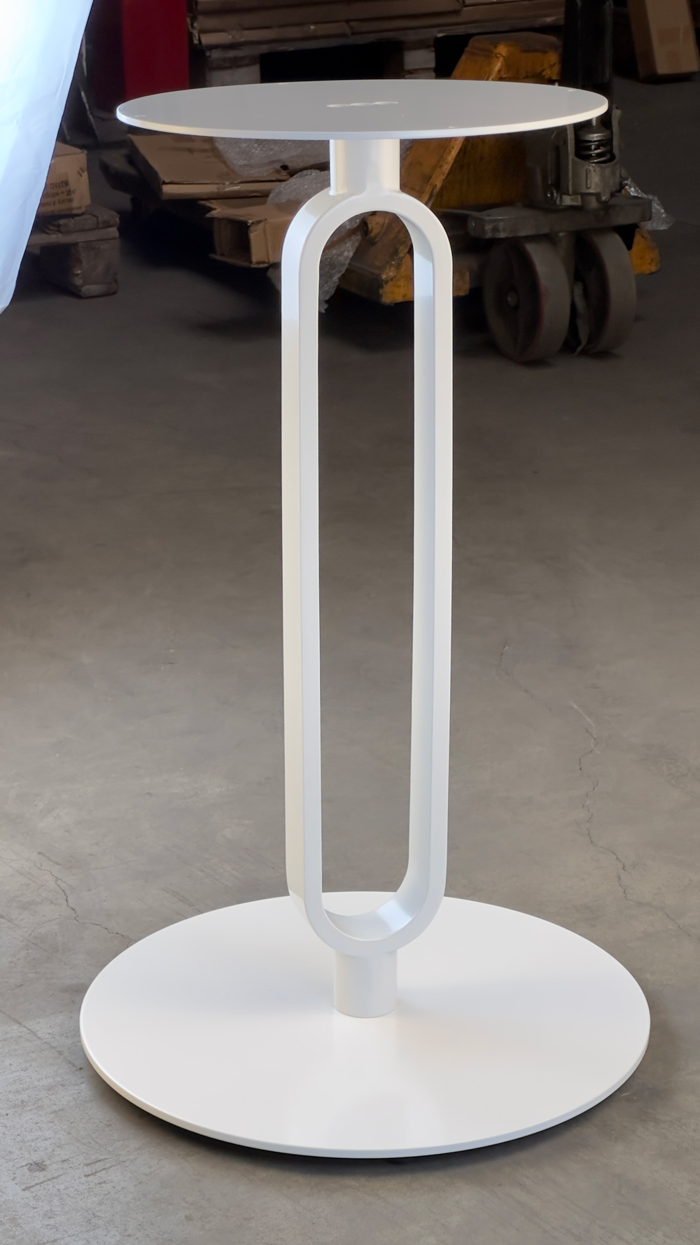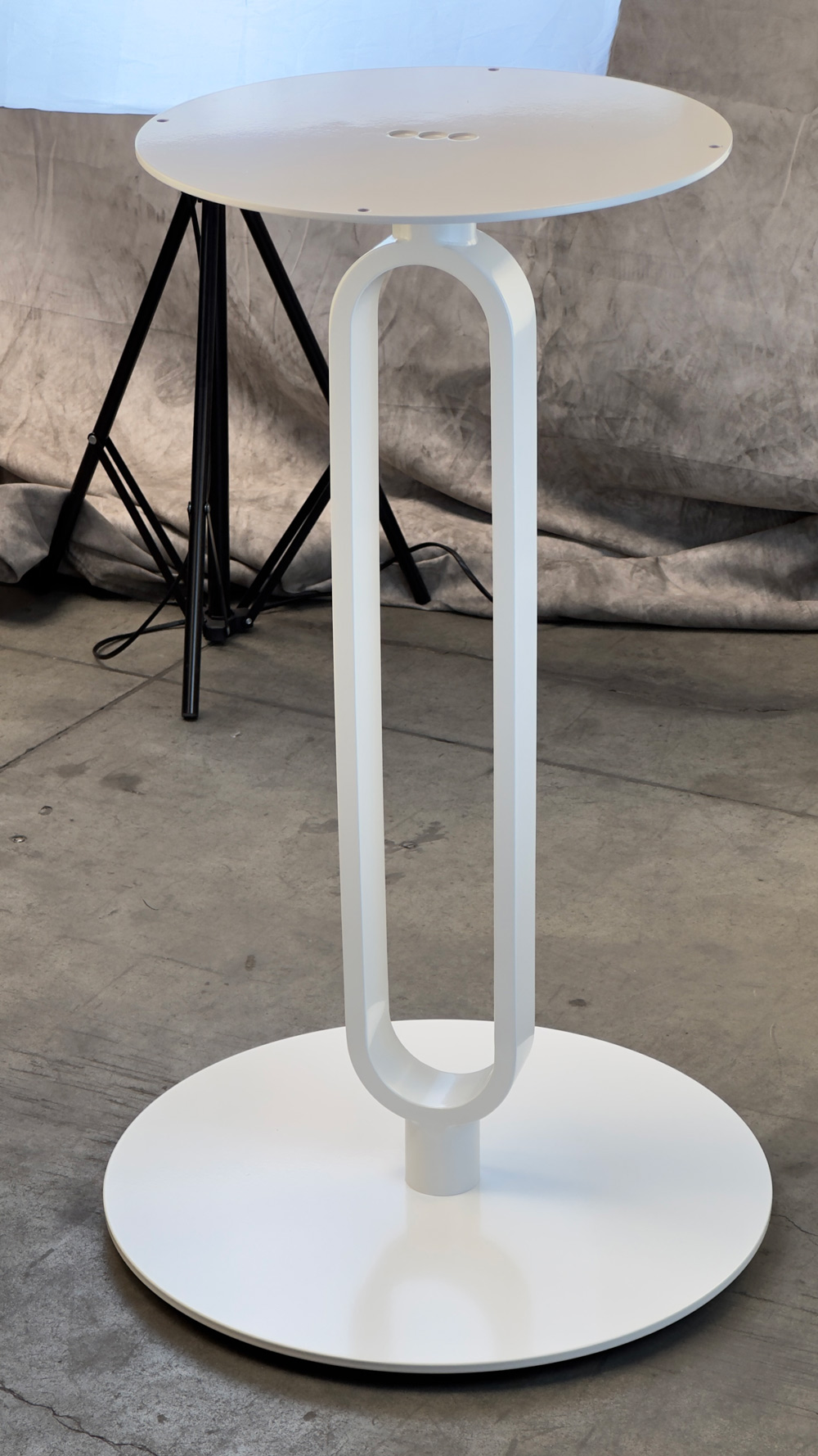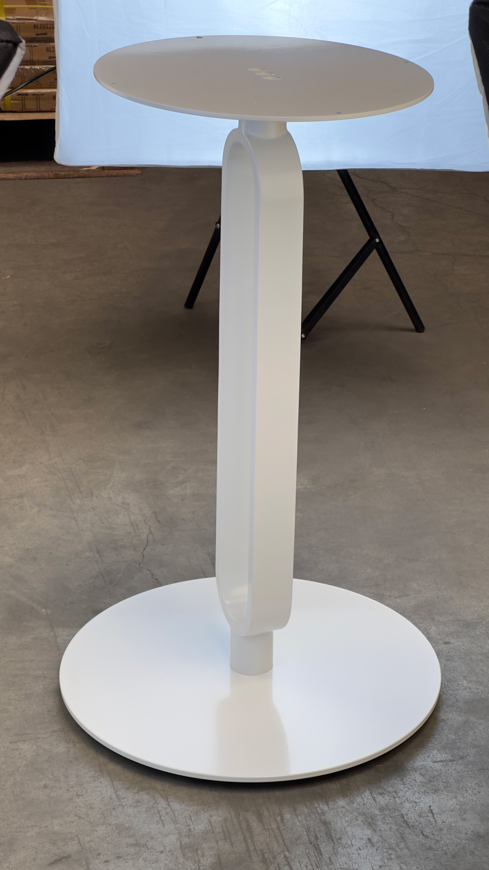 Подстолье из стали белого цвета. Размер верхнего крепления: D35 см. Рекомендуемый размер столешницы: D-70.