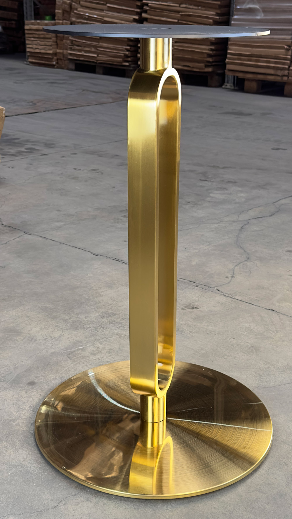 Подстолье из нержавеющей стали золотого цвета (нитрид титана). Лаковое покрытие. Размер верхнего крепления: D35 см. Рекомендуемый размер столешницы: Ø70.