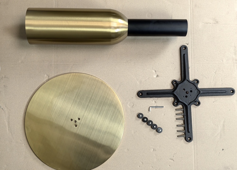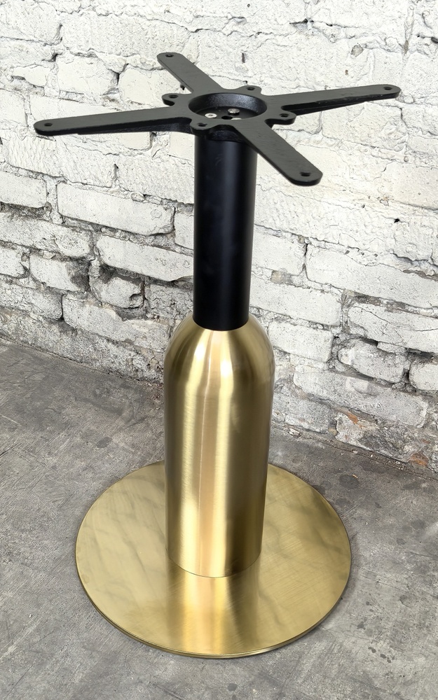 Подстолье. Нижняя часть из полированной нержавеющей стали (матовое) золотого цвета. Верхняя часть из стали покрытой черным порошком. Рекомендуемый размер столешницы: Ø80.