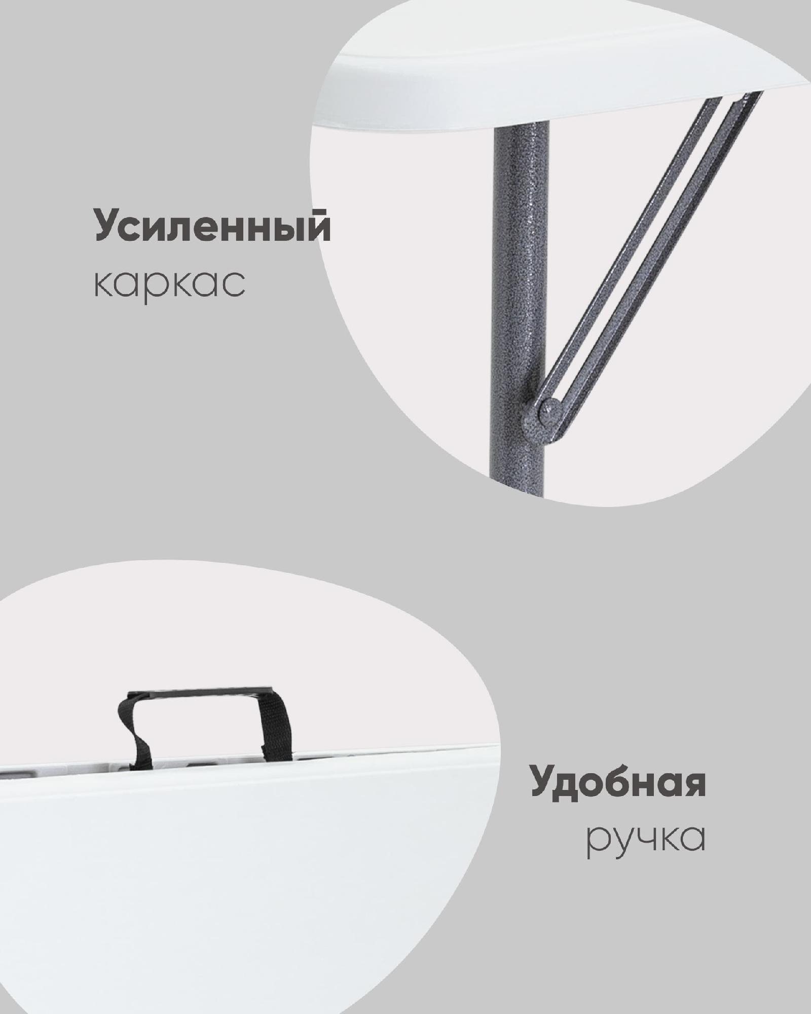 Для каркаса используется стальная труба особой прочности 25*1 мм, а столешница выполнена из 100% не переработанного полиэтилена HDPE (полиэтилен высокой плотности). Считается одним из более безопасных видов пластика. HDPE пластик выдерживает высокие нагрузки, не трескается при ударной нагрузке, эластичен в диапазоне температур от –70 до +100 °С.