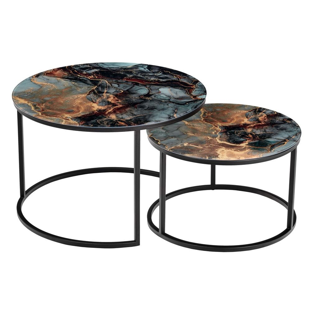 Элегантная пара кофейных столиков Tango станет изящным дополнением любой гостинной или даже спальни. Рисунок на столешнице выполенной из закалённого стекла завораживает и притягивает взгляд. Столики можно расположить парой или расставить по отдельности. Чёрные ножки позволят вписать этот набор в любой интерьер. Размер большого столика: диам.60х41см. Размер маленького столика: диам.47,5х31см