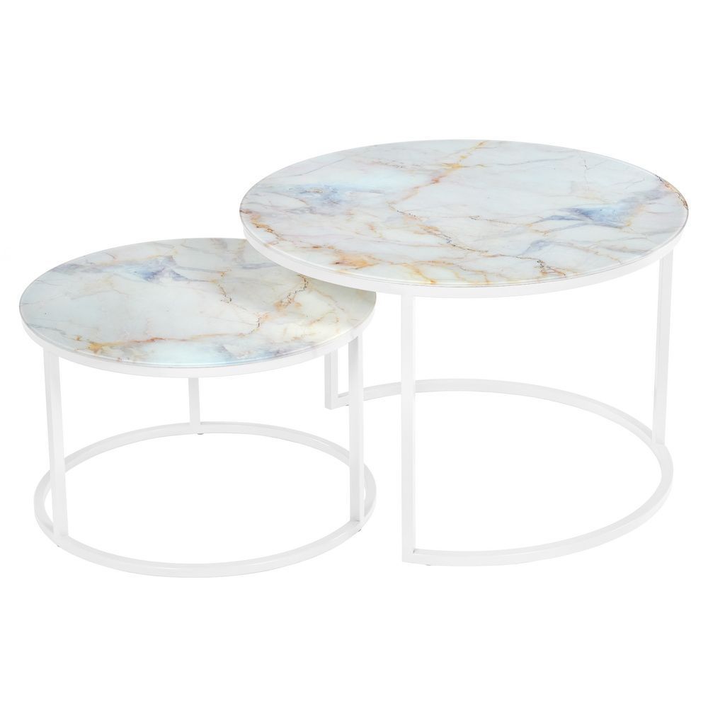 Элегантная пара кофейных столиков Tango станет изящным дополнением любой гостинной или даже спальни. Рисунок на столешнице имитирующий натуральный мрамор завораживает и притягивает взгляд. Столики можно расположить парой или расставить по отдельности. Белые ножки позволят вписать этот набор в светлый интерьер. Размер большого столика: диам.60х41см. Размер маленького столика: диам.47,5х31см