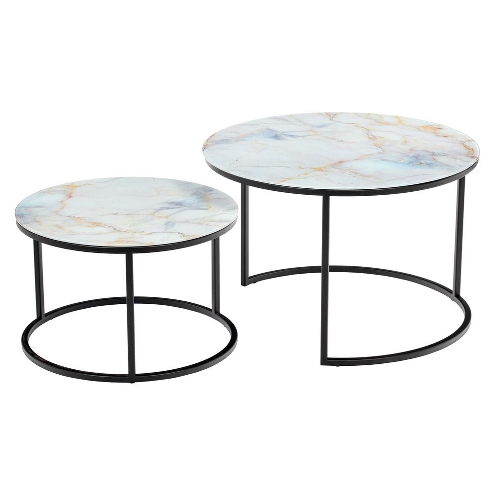 Элегантная пара кофейных столиков Tango станет изящным дополнением любой гостинной или даже спальни. Рисунок на столешнице выполенной из закалённого стекла с имитацией натурального камня завораживает и притягивает взгляд. Столики можно расположить парой или расставить по отдельности. Чёрные ножки позволят вписать этот набор в любой интерьер. Размер большого столика: диам.60х41см. Размер маленького столика: диам.47,5х31см