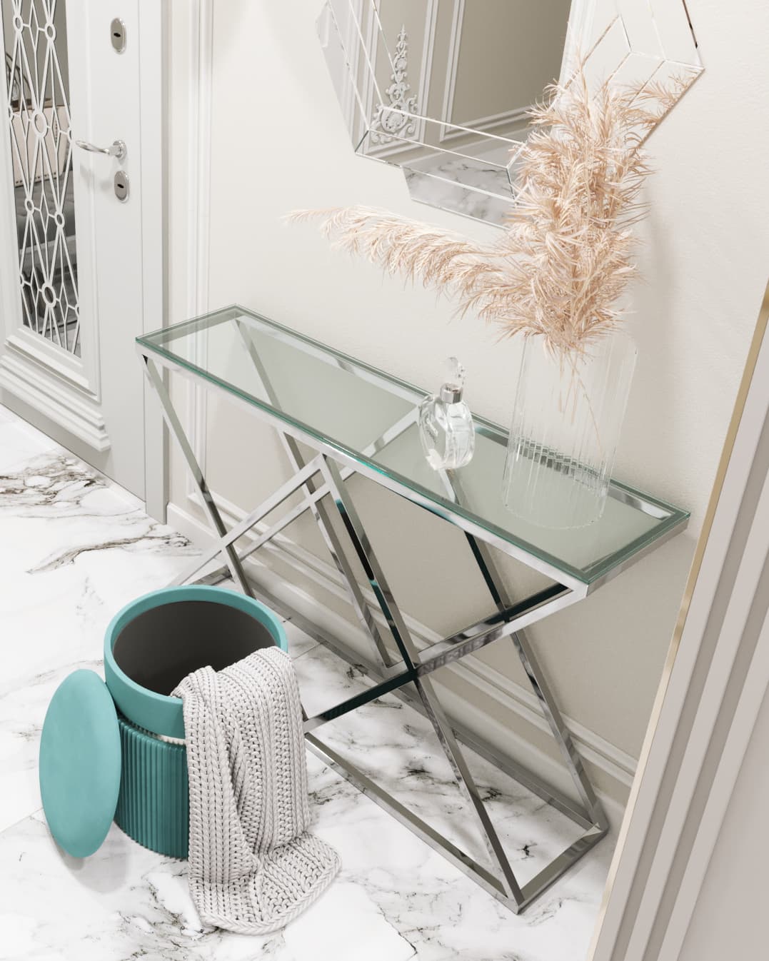 Консоль ИНСИГНИЯ, благодаря оригинальной форме, станет ярким дизайнерским акцентом в интерьере. Каркас консоли изготовлен из нержавеющей стали, столешница - закаленное стекло.