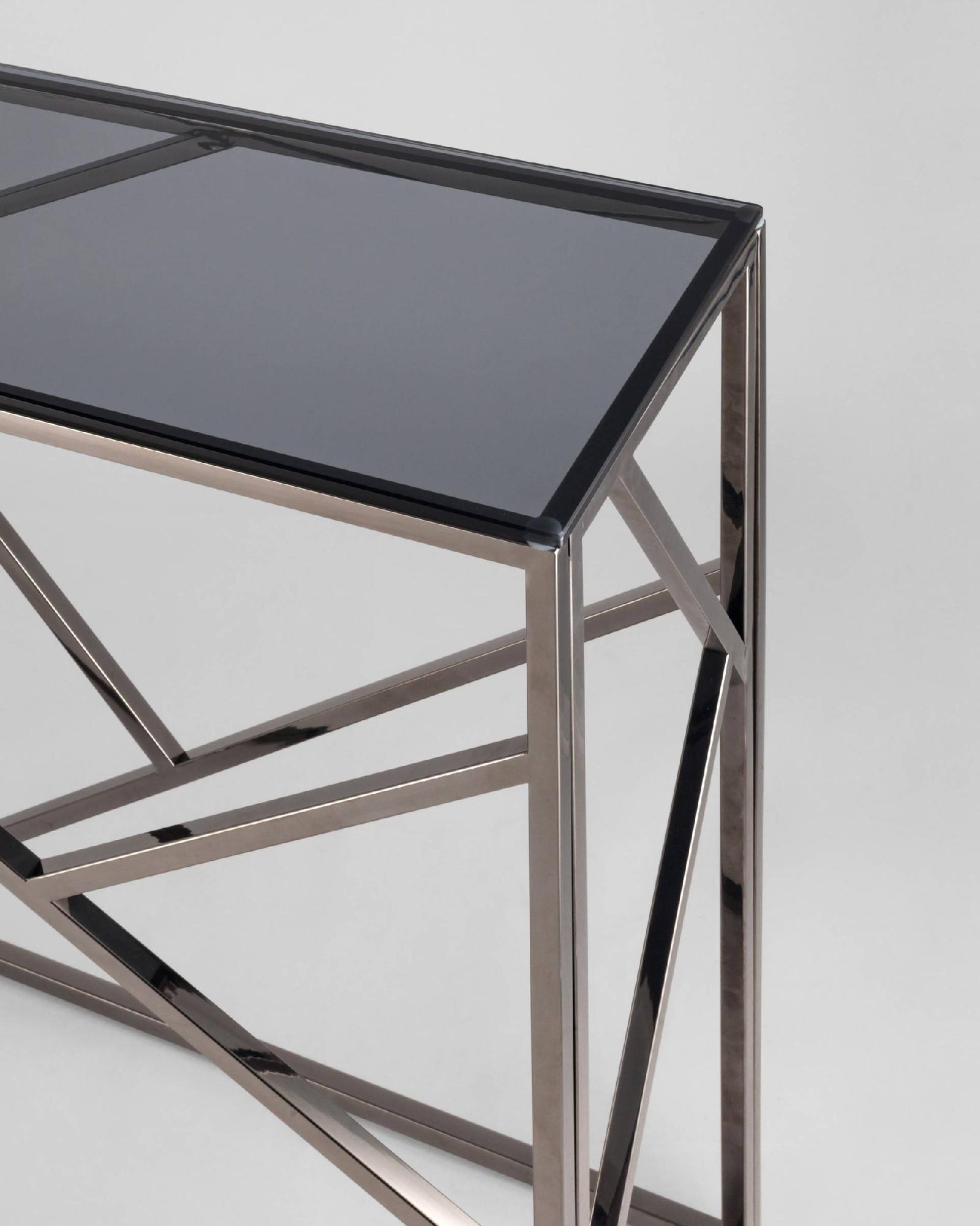 Консоль АРТ ДЕКО благодаря оригинальной форме станет ярким дизайнерским акцентом в интерьере. Каркас консоли изготовлен из нержавеющей стали, столешница - закаленное стекло.