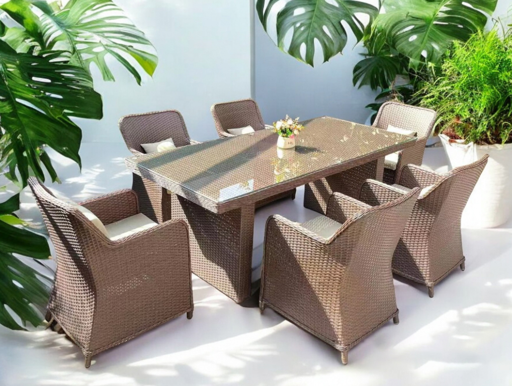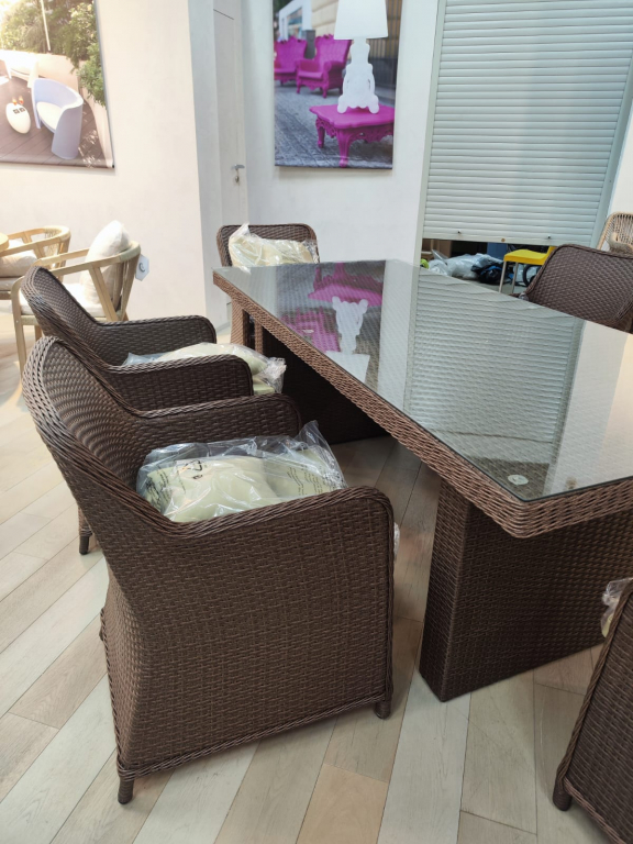 Комплект обеденной мебели Barcelona - представляет собой стильное и удобное решение для вашего интерьера. Товар доступен в различных цветовых вариантах, включая коричневый, что позволяет выбрать оптимальное решение под ваш стиль и предпочтения. Каркас изделия - металл, обеспечивает прочность и долговечность конструкции, при этом сохраняя легкость и изящество дизайна.