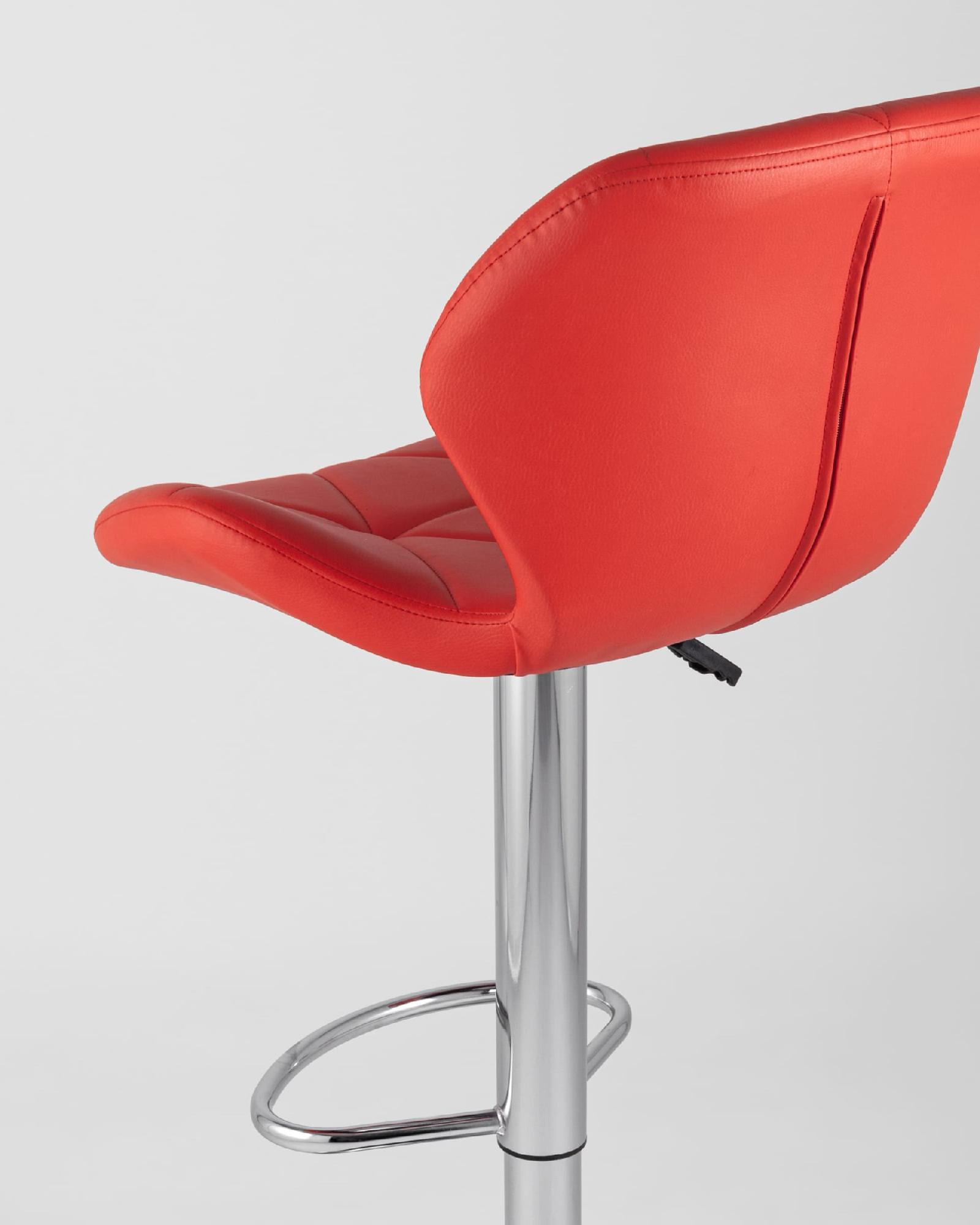 Спинка и сиденье обиты экокожей в красном цвете. Ножка выполнена из хромированного металла. Функция регулировки высоты сидения позволяет подобрать наиболее удобное положение.
