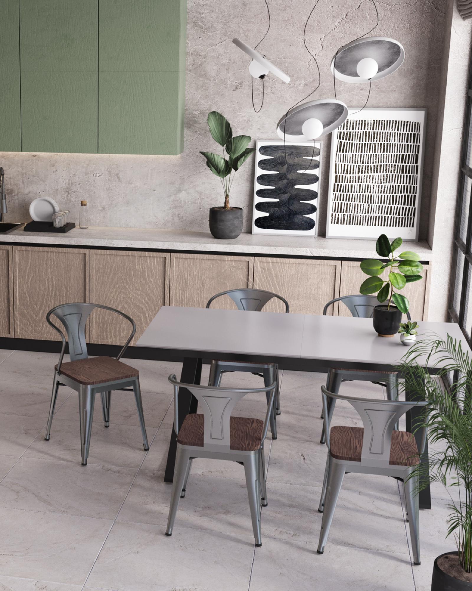 Cтул Tolix серебристого цвета привлекает внимание необычным дизайном и строгой окраской. Наиболее выразительная деталь – массивное металлическое основание серебристого цвета, благодаря которому модель устойчива даже на неровных поверхностях. Широкая низкая спинка в тон основания выполнена из оцинкованного металла с порошковым напылением, сиденье – из натурального дерева цвета венге. Модель «Толикс» подойдет для дома, может использоваться в кафе и барах, на открытых террасах ресторанов, где предусмотрен интерьер в стиле Лофт.