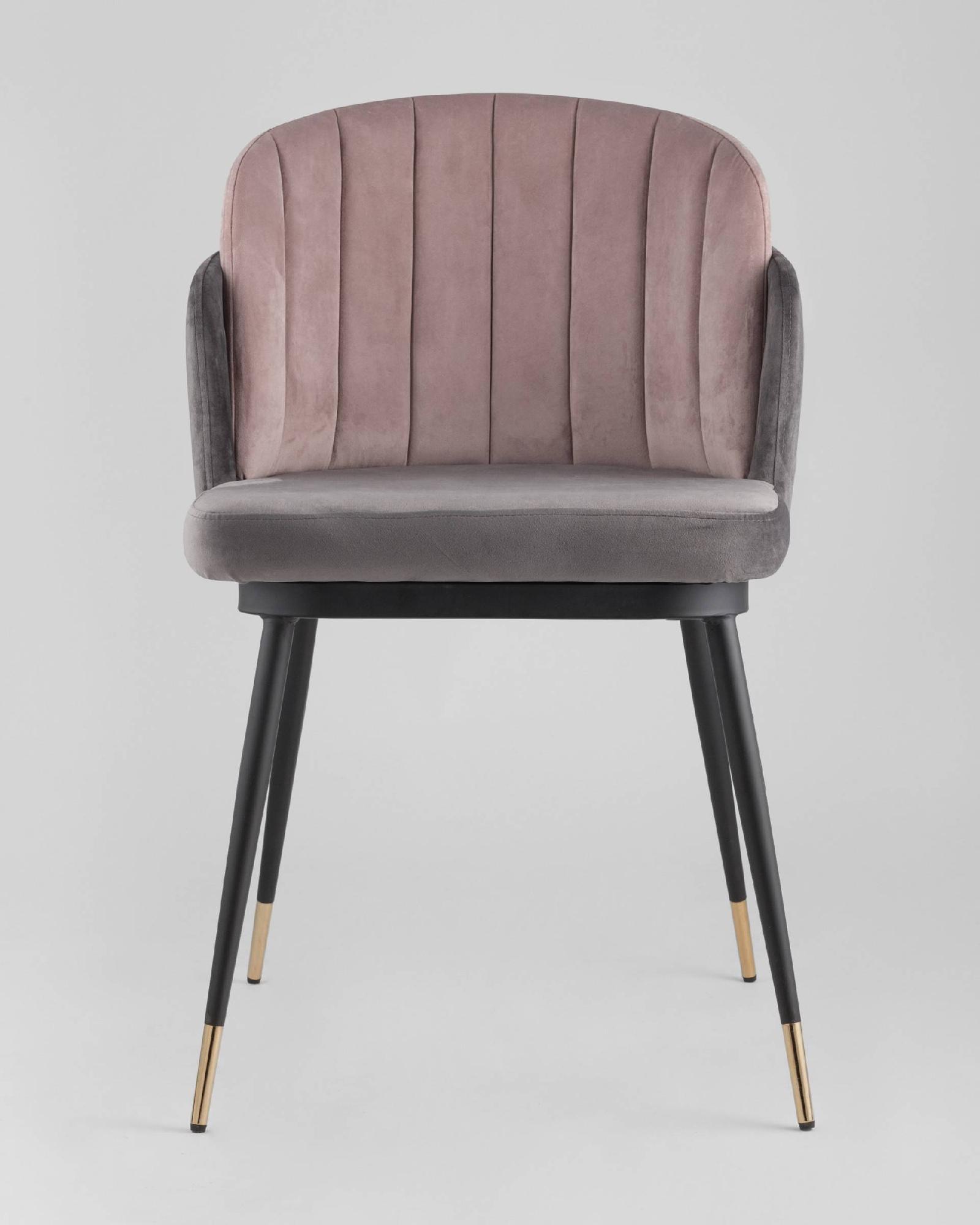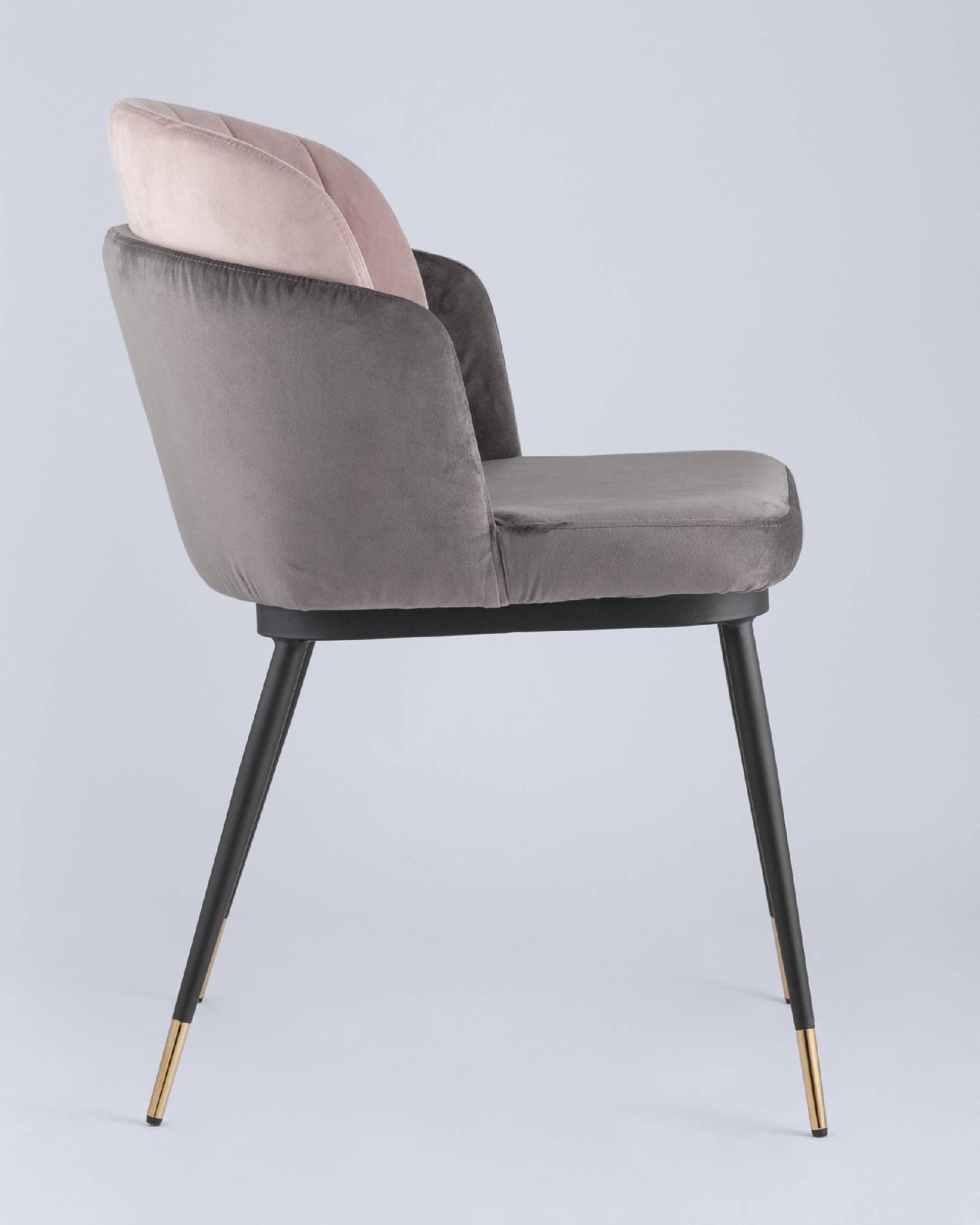 Мягкий двухцветный стул с обивкой из велюра. Надежная опора достигается благодаря металлическому каркасу и удобным устойчивым ножкам, украшенным золотом. Спинка состоит из двух элементов, внутренняя часть с красивой вертикальной строчкой.