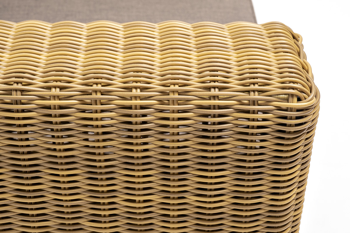 Кресло оснащено каркасом из прочного алюминия, ручное круглое плетение является основным декоративным элементом мебели. Оно выполнено из искусственного ротанга в соломенном цвете.