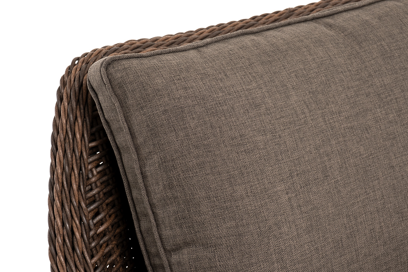 В комплекте с уличным ротанговым креслом идут мягкие подушки со съёмными чехлами серо-коричневого оттенка. Они пошиты из полиэстера, который не боится повышенной влажности благодаря наличию влагоотталкивающей пропитки. Плотность ткани составляет 230гр/м2.
