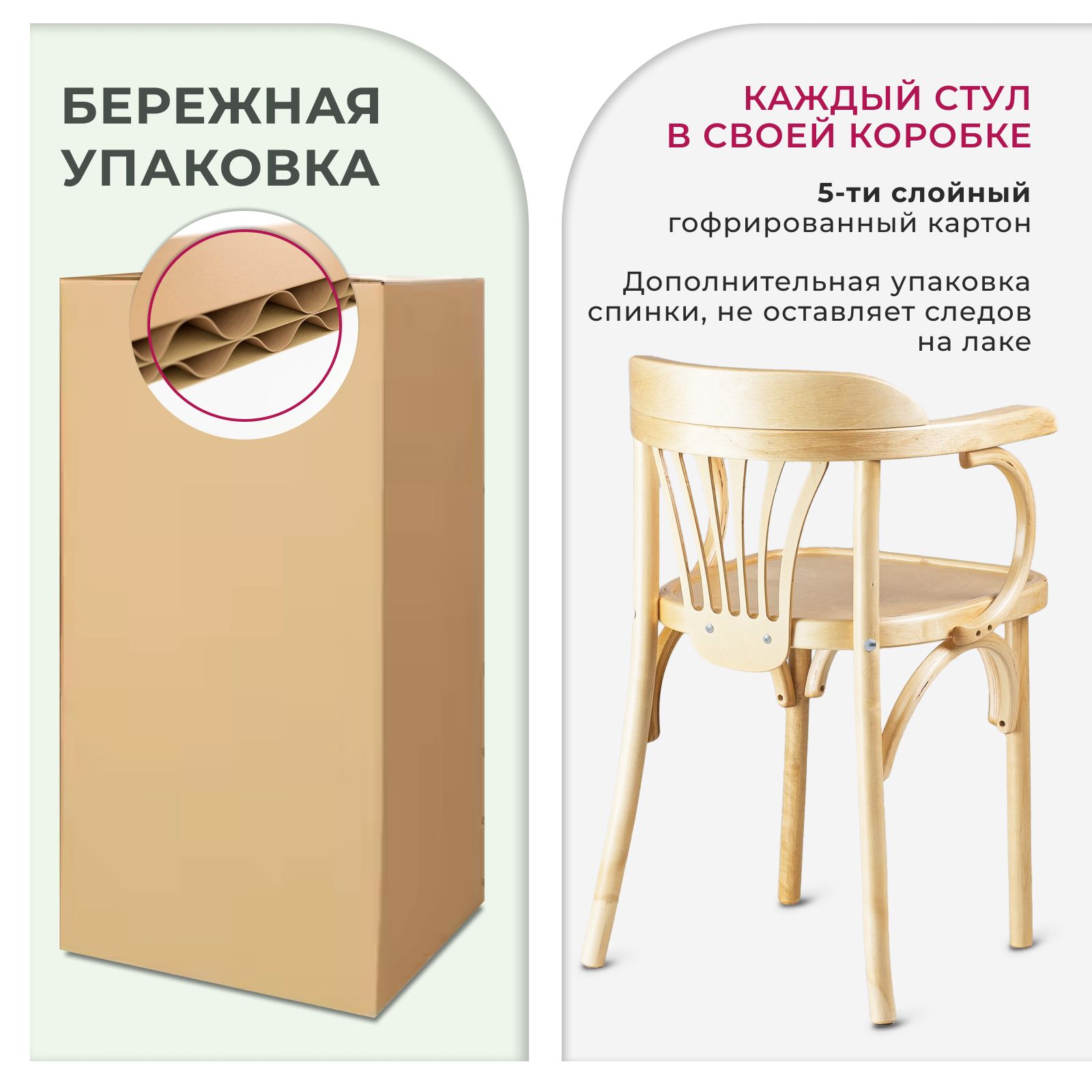 Особого внимания заслуживает бережная упаковка этого товара. Каждый стул для кафе и ресторанов поставляется в собственной коробке, защищенной 5-слойным гофрированным картоном. Для сохранности спинки предусмотрена дополнительная упаковка, которая не оставляет следов на лаке.